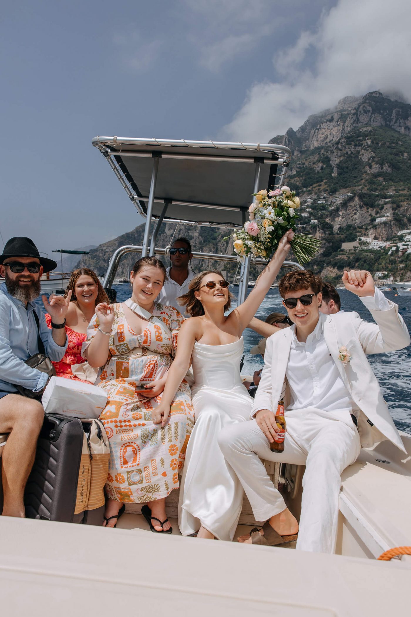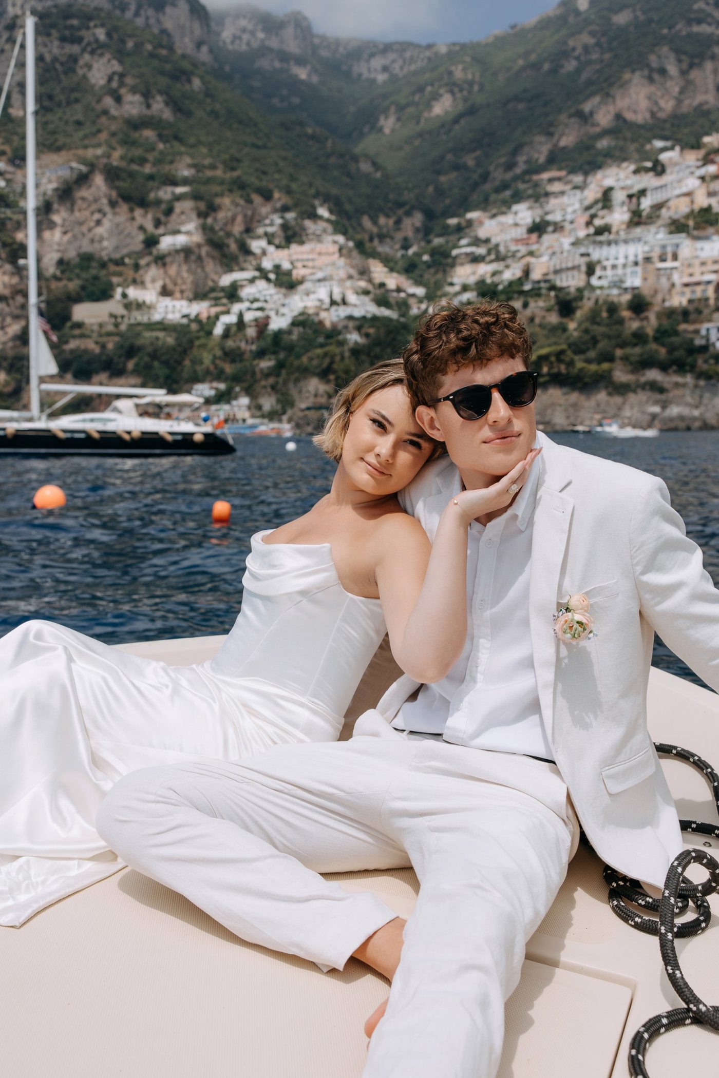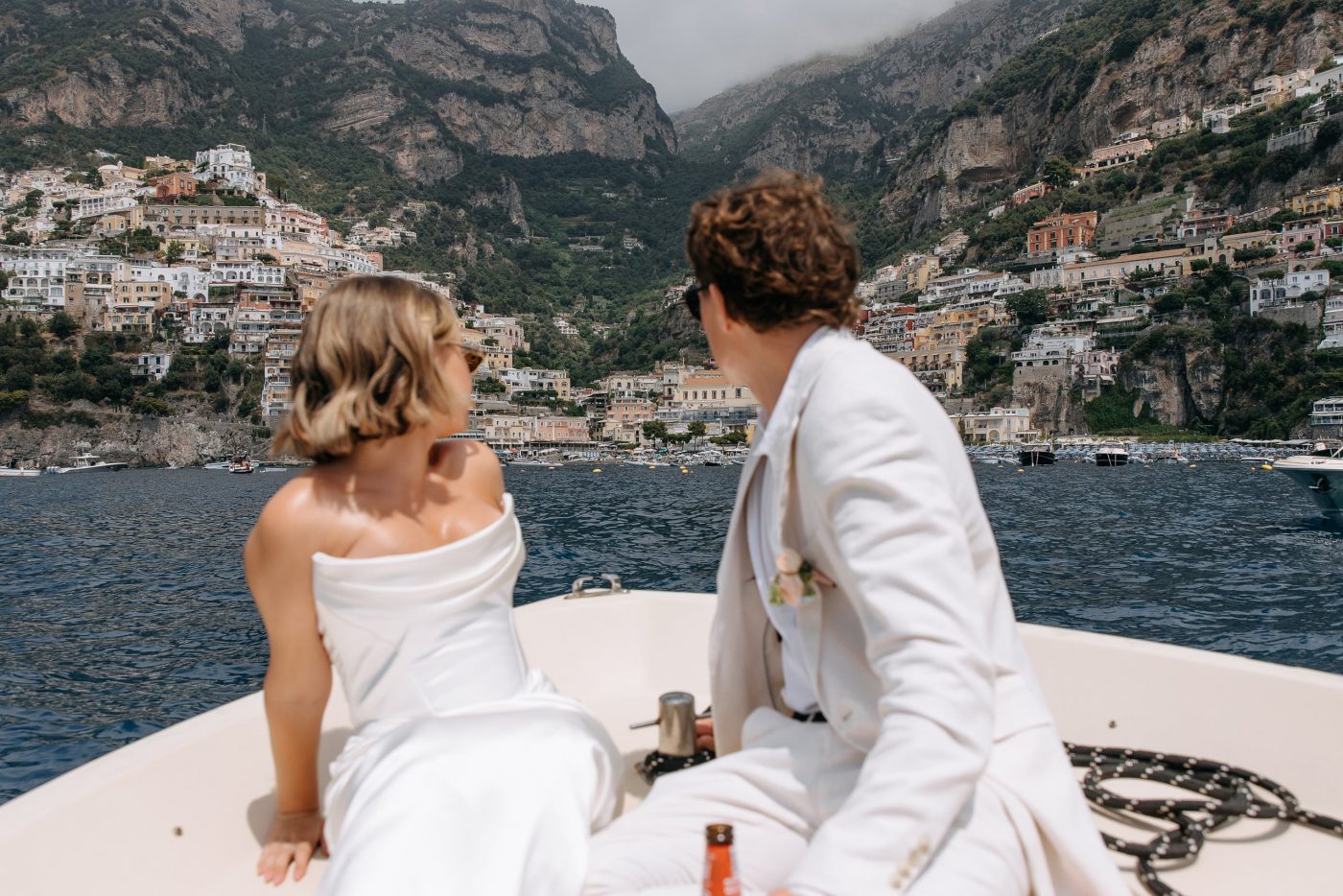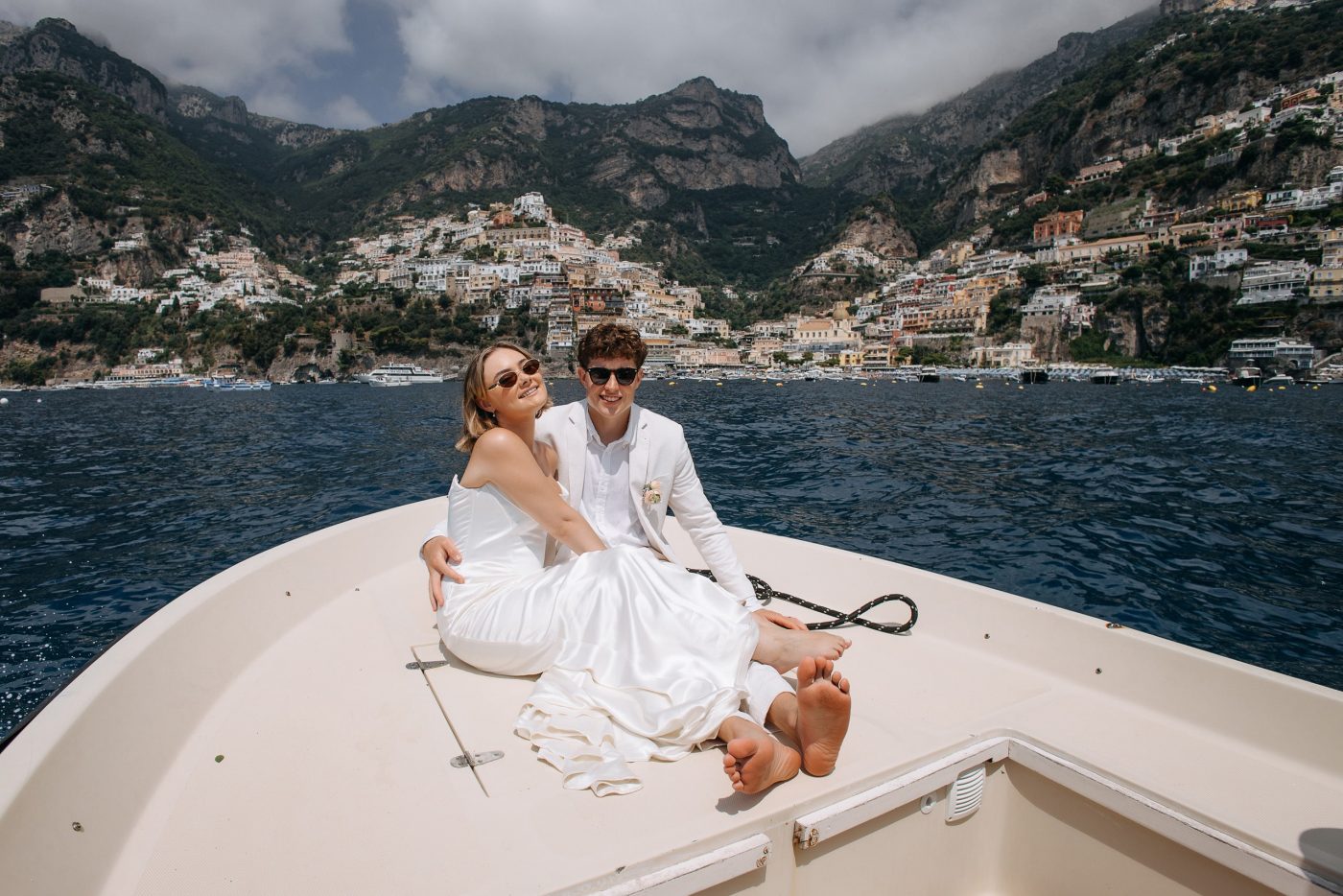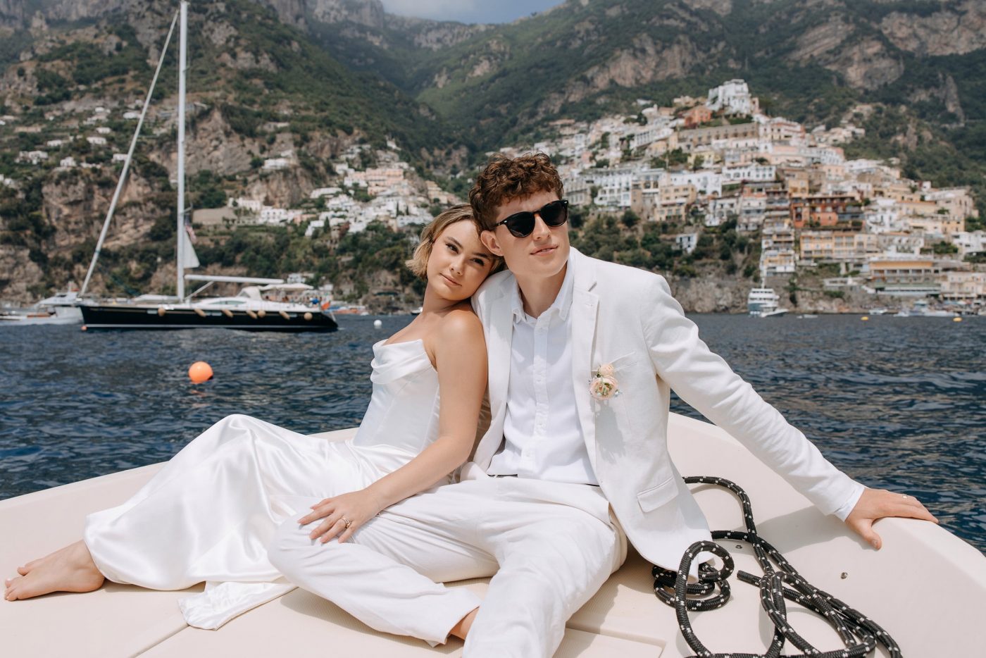 After the emotional ceremony, the couple set sail on a scenic boat trip along the Amalfi Coast, enjoying the fresh sea breeze and capturing unforgettable moments on the Mediterranean. The combination of stunning landscapes, elegant floral decor, and a relaxed yet sophisticated atmosphere made their wedding a true Italian dream.