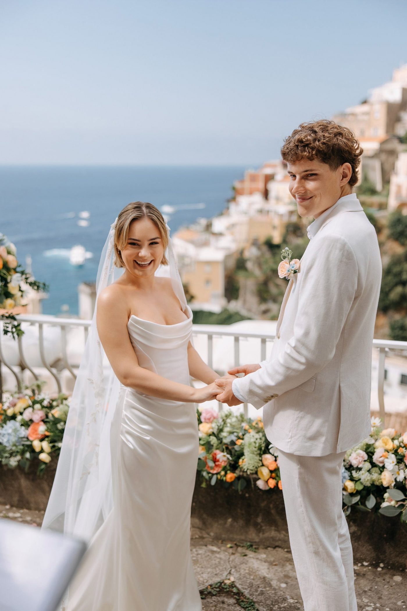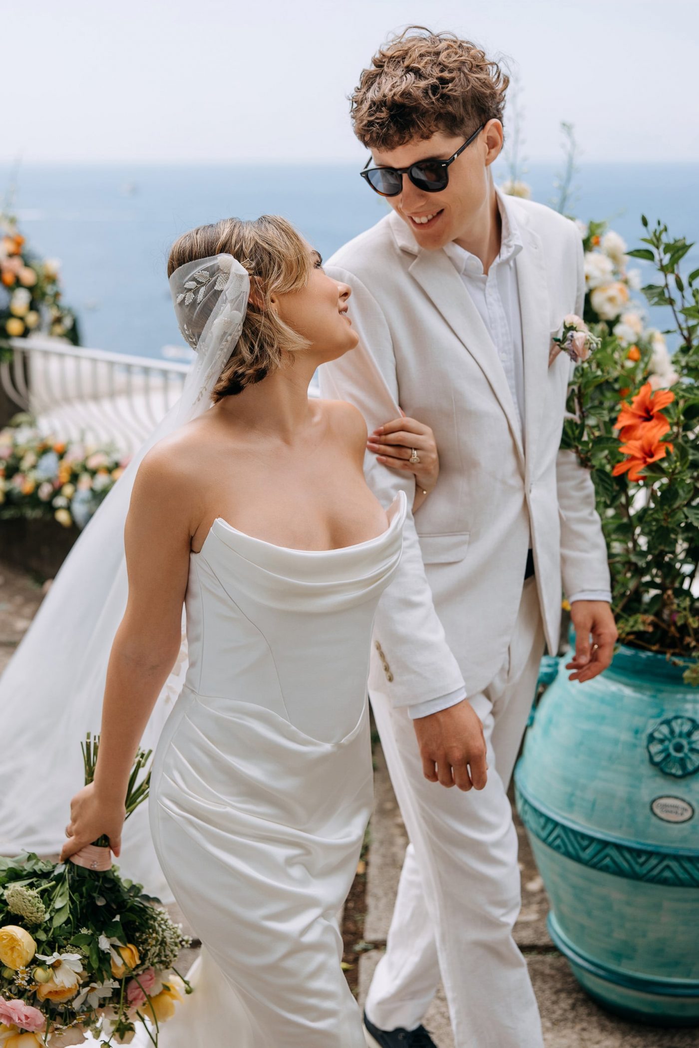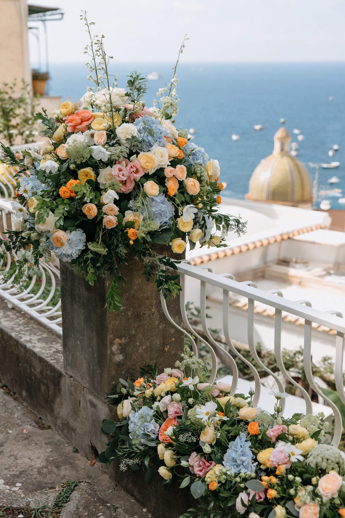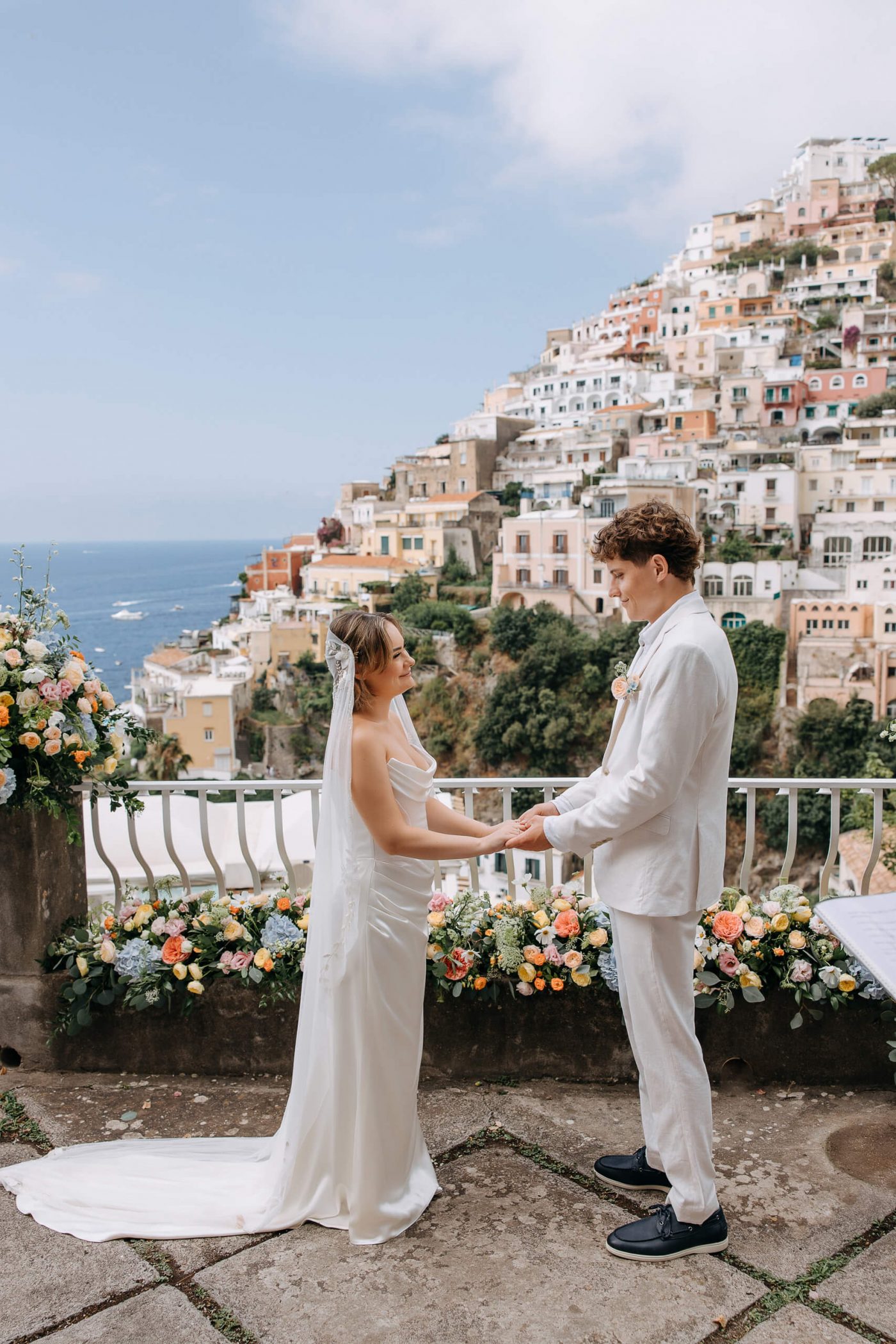 After the emotional ceremony, the couple set sail on a scenic boat trip along the Amalfi Coast, enjoying the fresh sea breeze and capturing unforgettable moments on the Mediterranean. The combination of stunning landscapes, elegant floral decor, and a relaxed yet sophisticated atmosphere made their wedding a true Italian dream.
