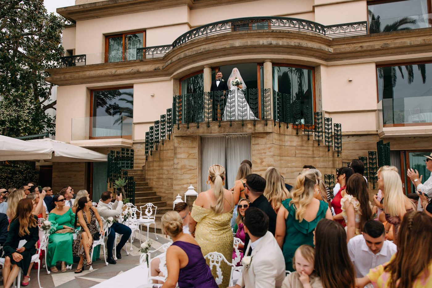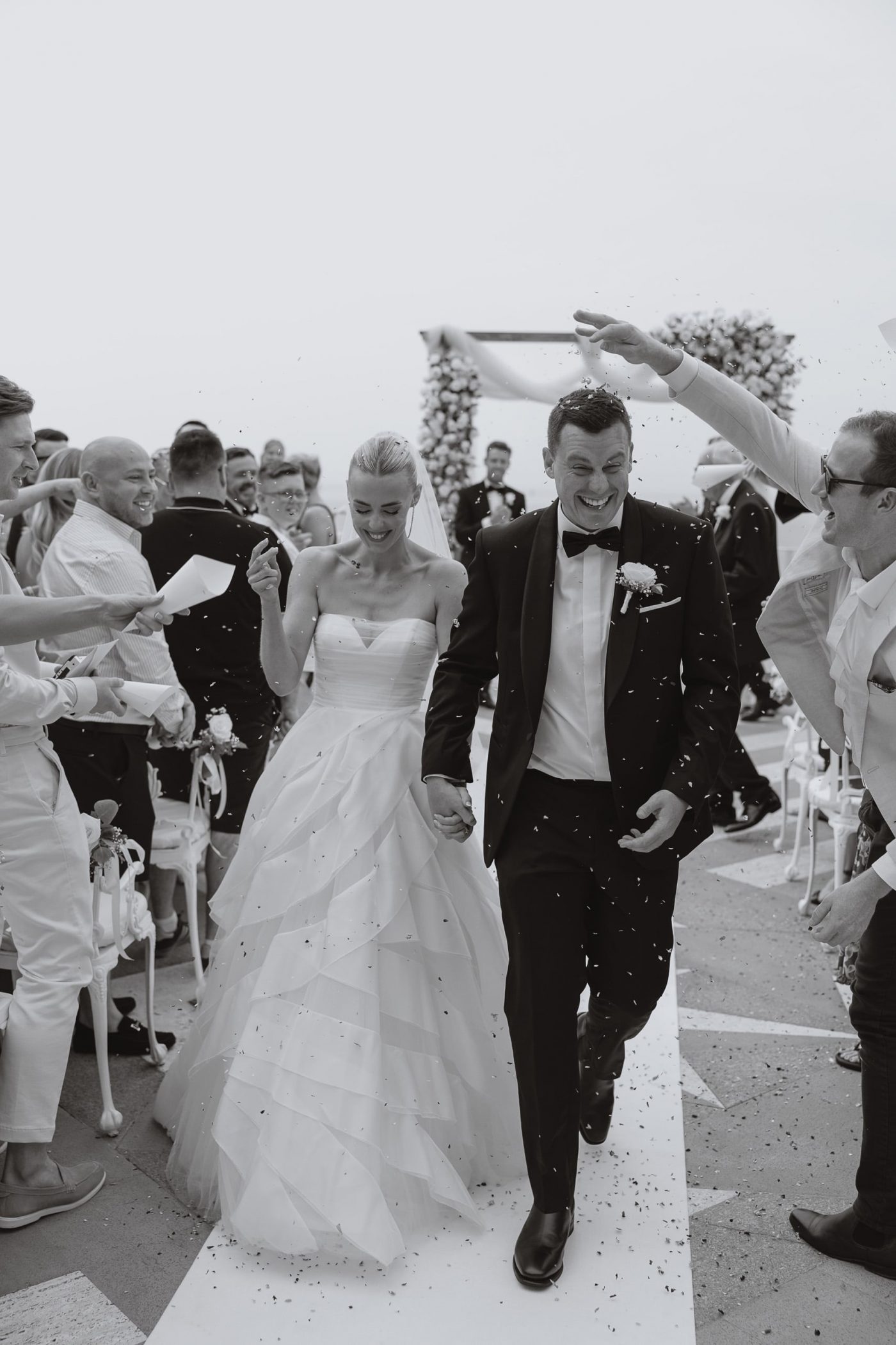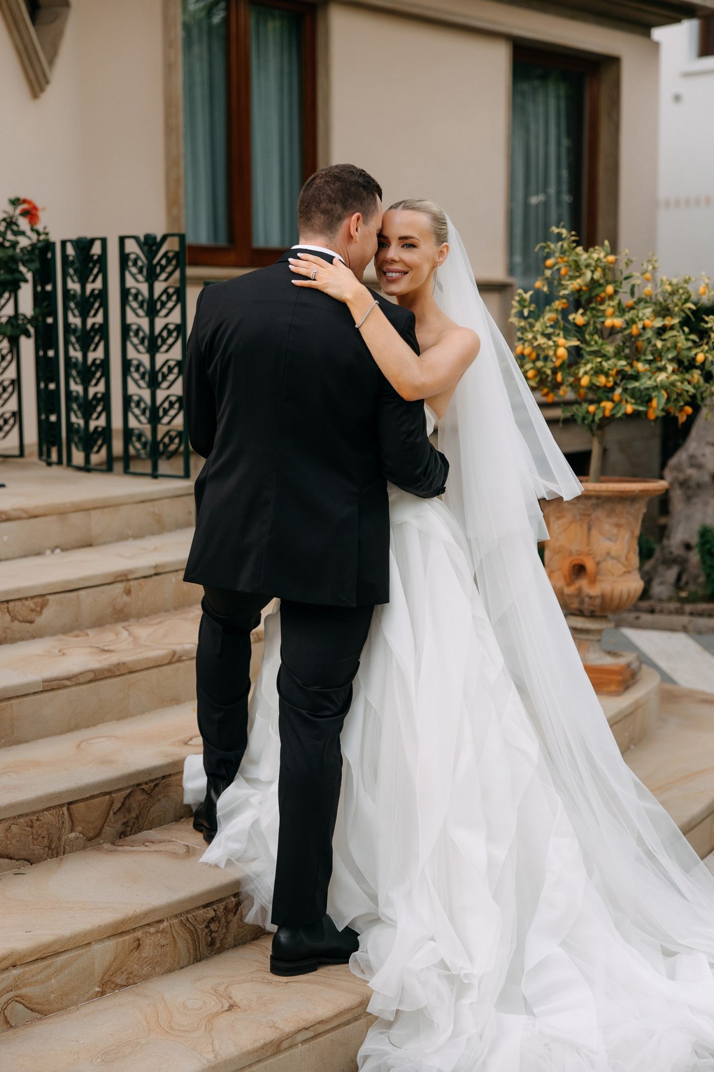 Fiona’s grand entrance was nothing short of cinematic. As she gracefully descended the villa’s iconic stairs, her smile lit up the moment, making it feel timeless. The couple exchanged vows surrounded by their closest family and friends, with the sea breeze adding a touch of magic to every word.