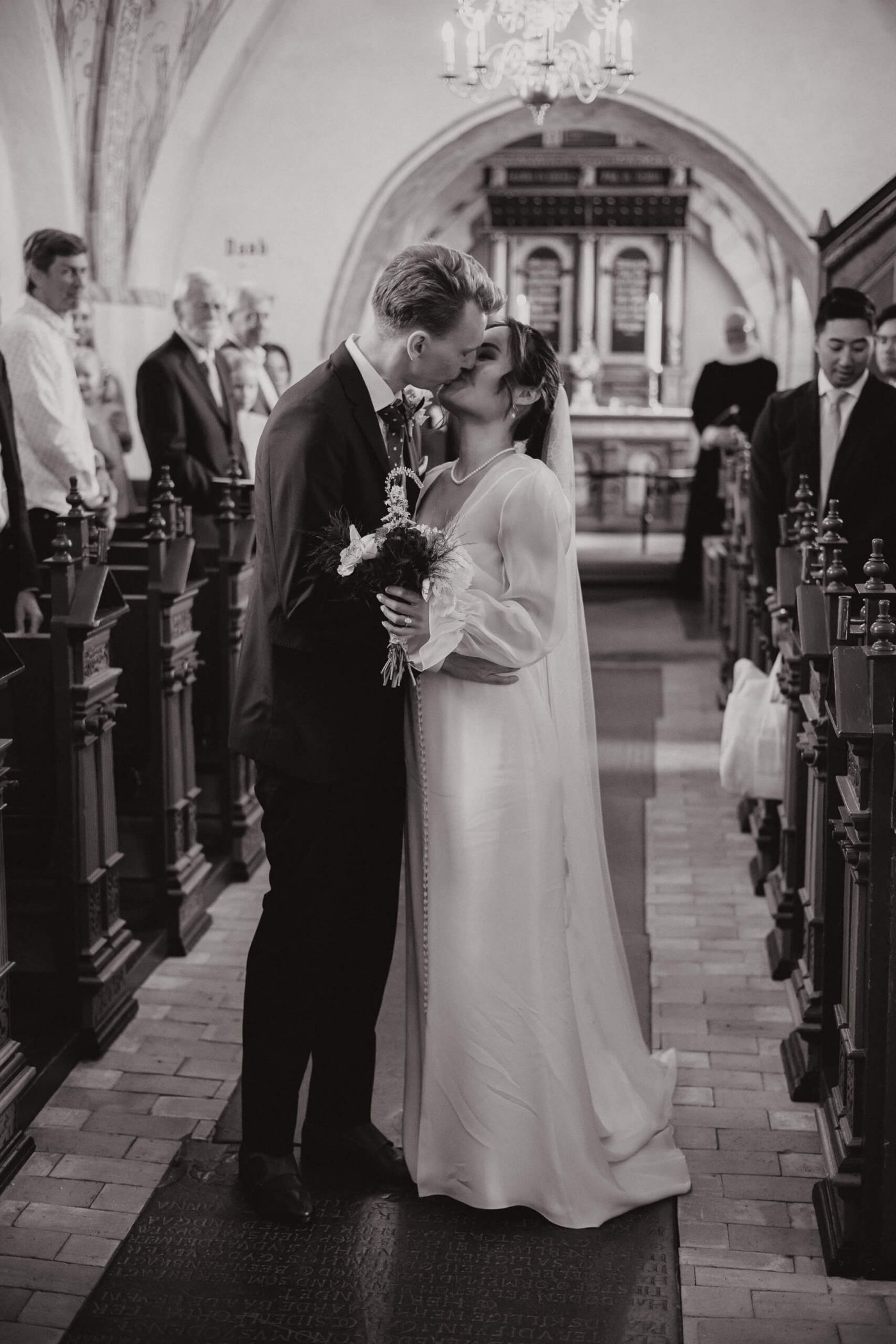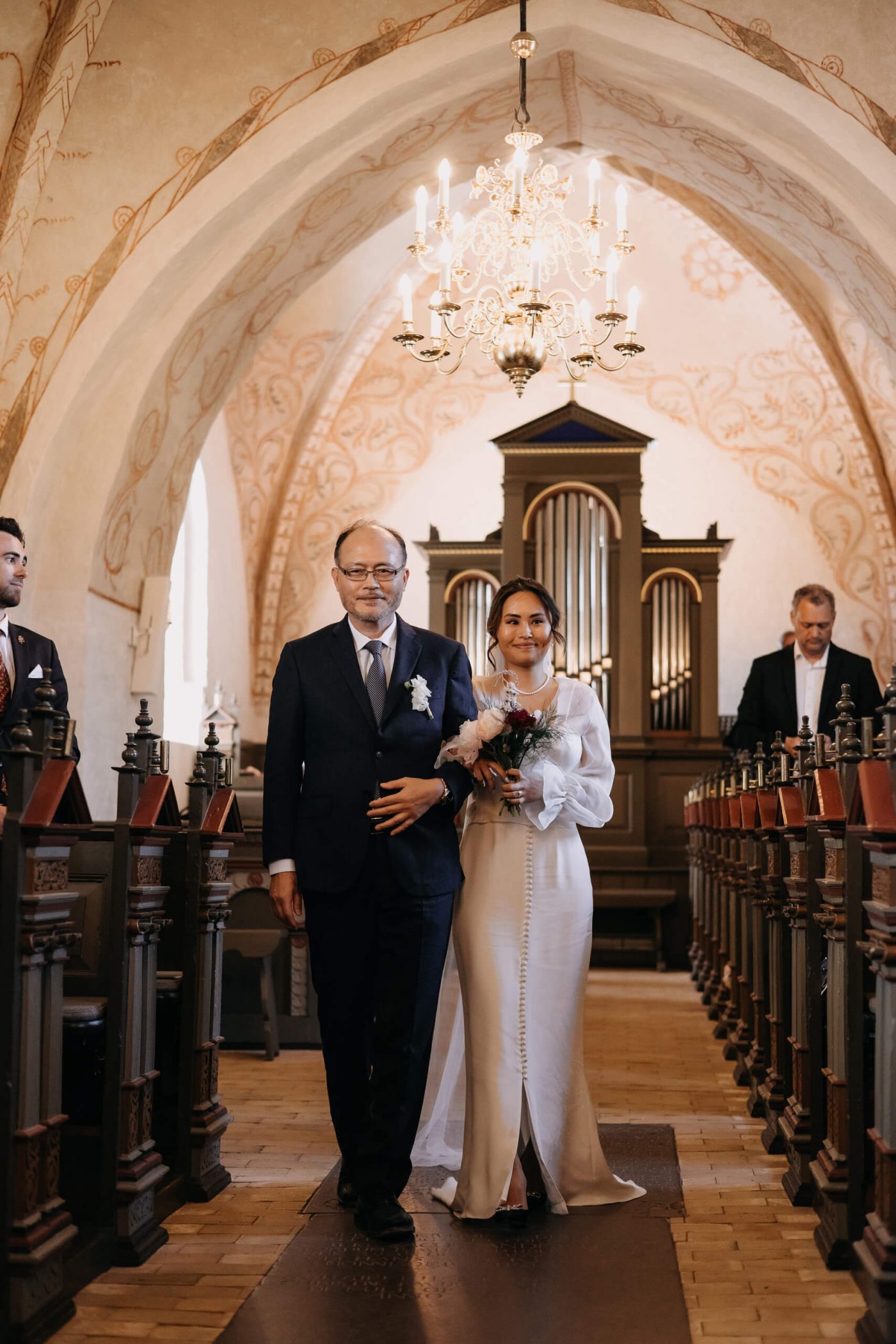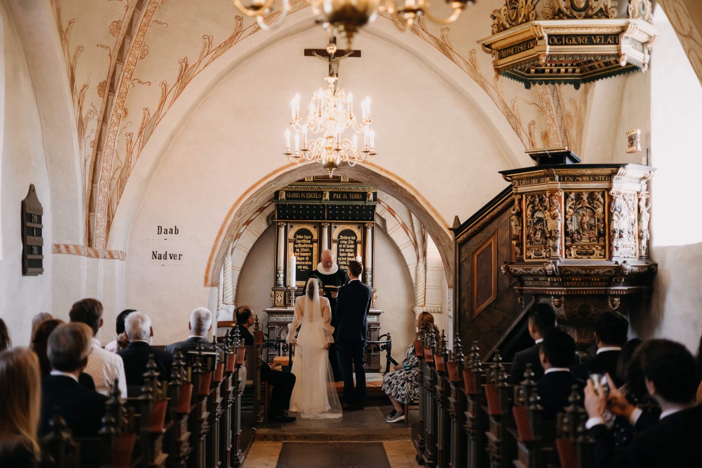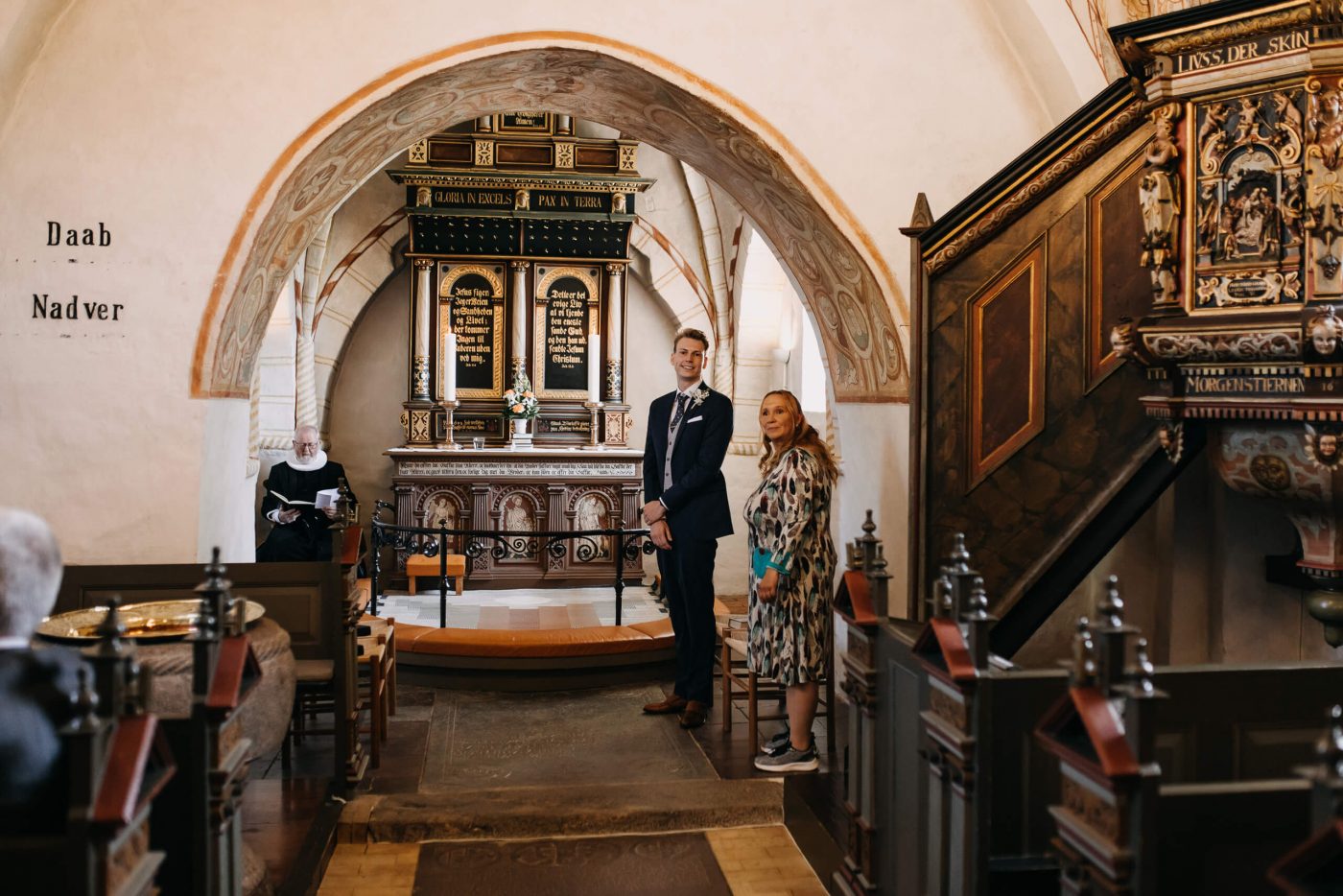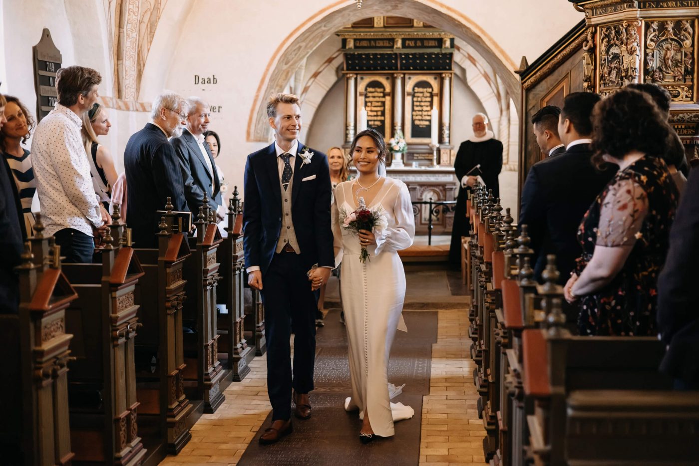 Allerslev Kirke is an exceptionally beautiful location for a wedding ceremony, situated not far from Roskilde. Guests gather near the church, eagerly awaiting the start of the ceremony. The summer sun is high, casting a warm glow under the tree canopies and inside the church, providing a pleasant coolness. Mark eagerly awaits Grace at the altar.