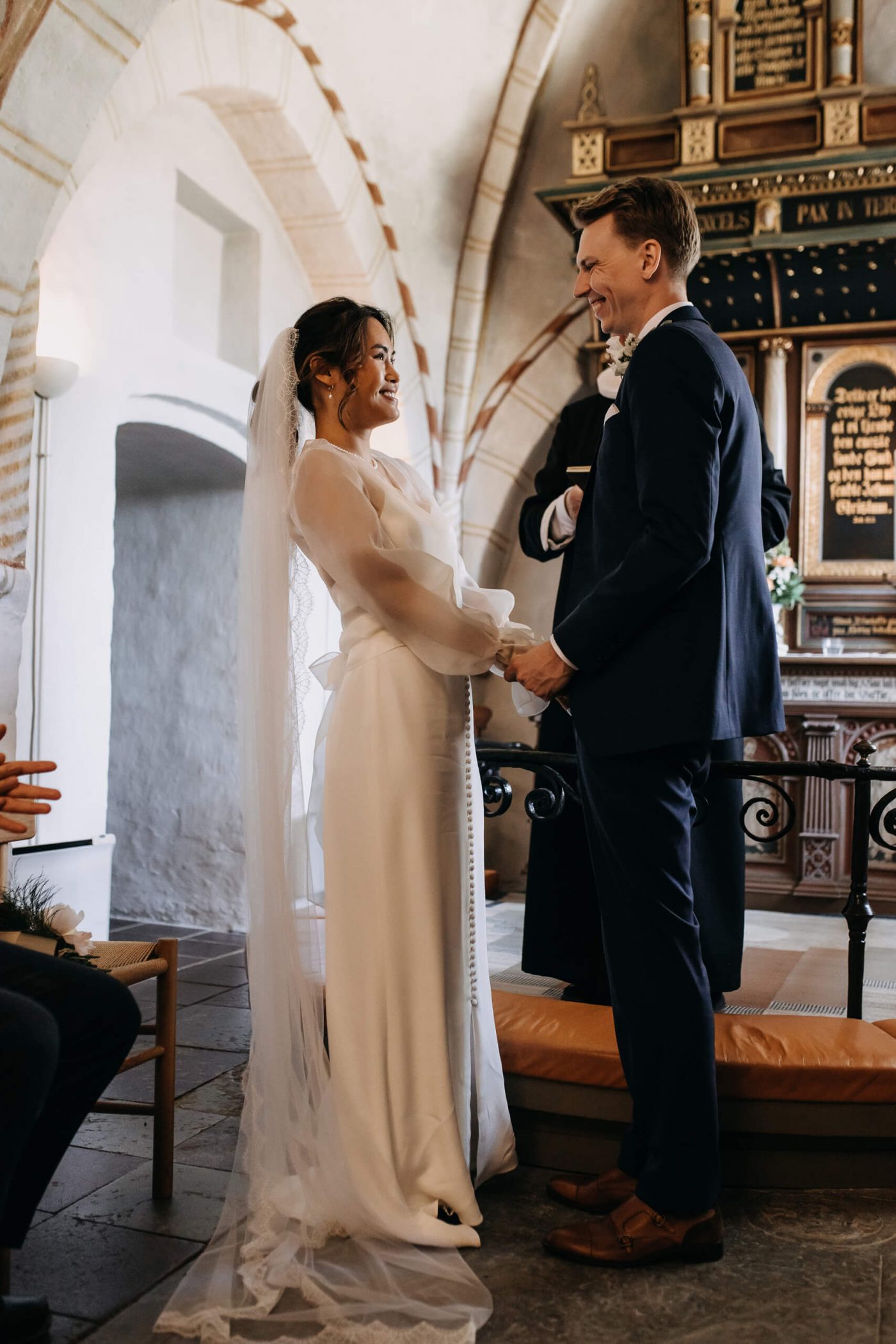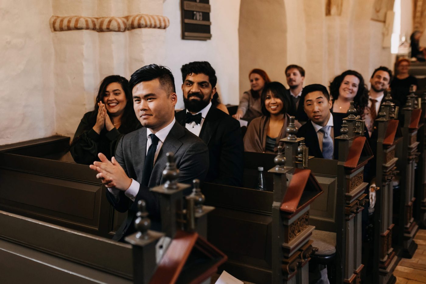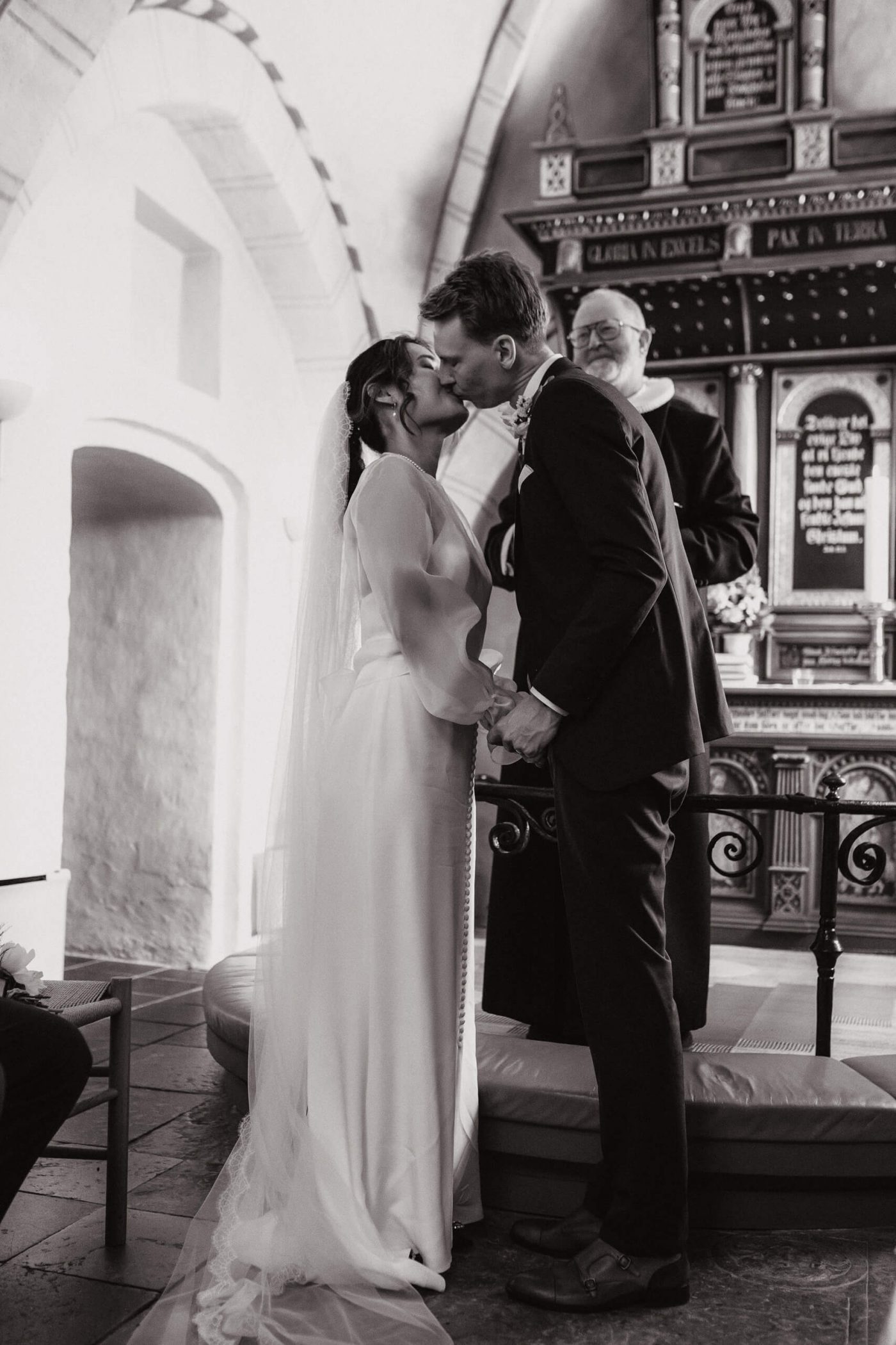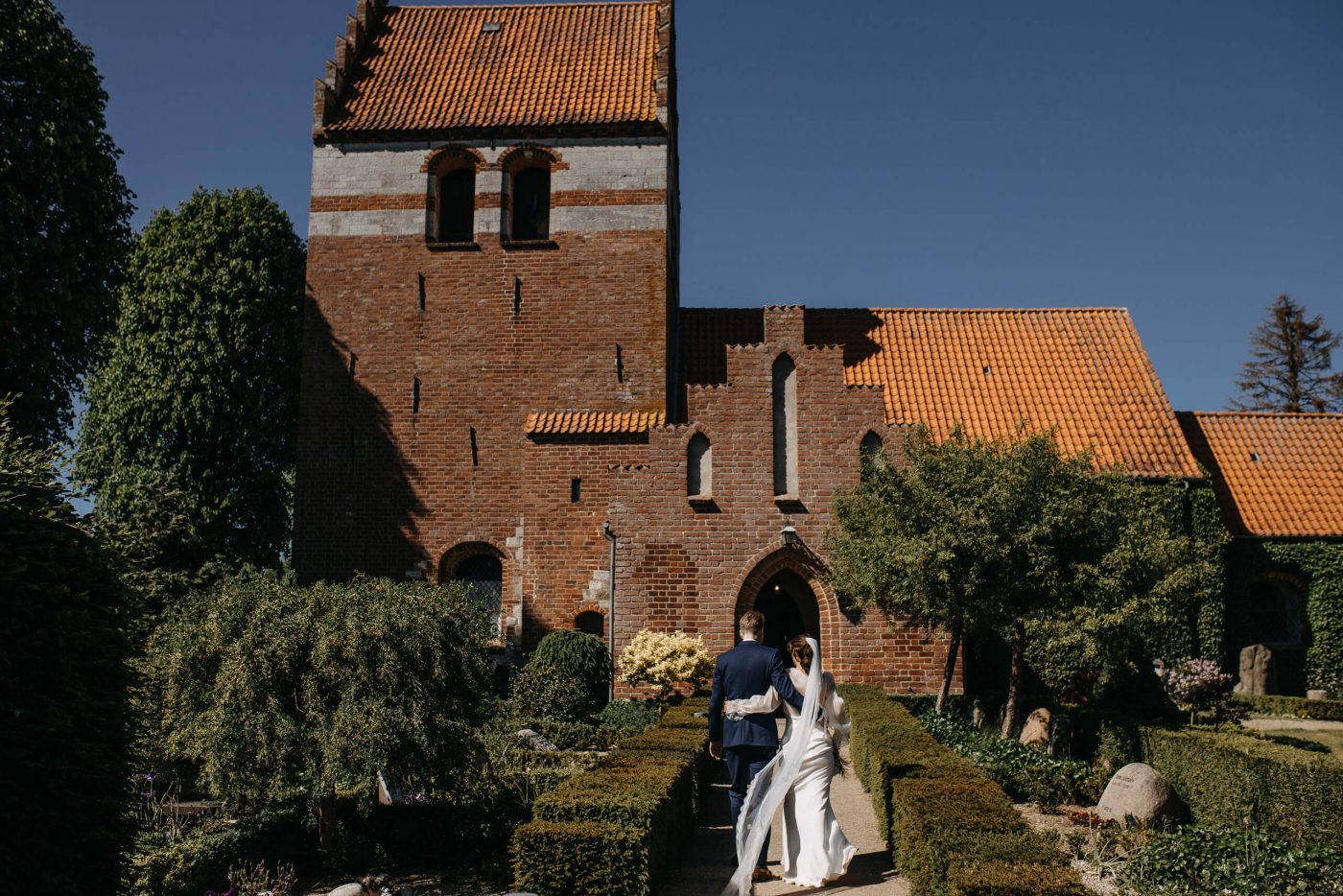 Allerslev Kirke is an exceptionally beautiful location for a wedding ceremony, situated not far from Roskilde. Guests gather near the church, eagerly awaiting the start of the ceremony. The summer sun is high, casting a warm glow under the tree canopies and inside the church, providing a pleasant coolness. Mark eagerly awaits Grace at the altar.