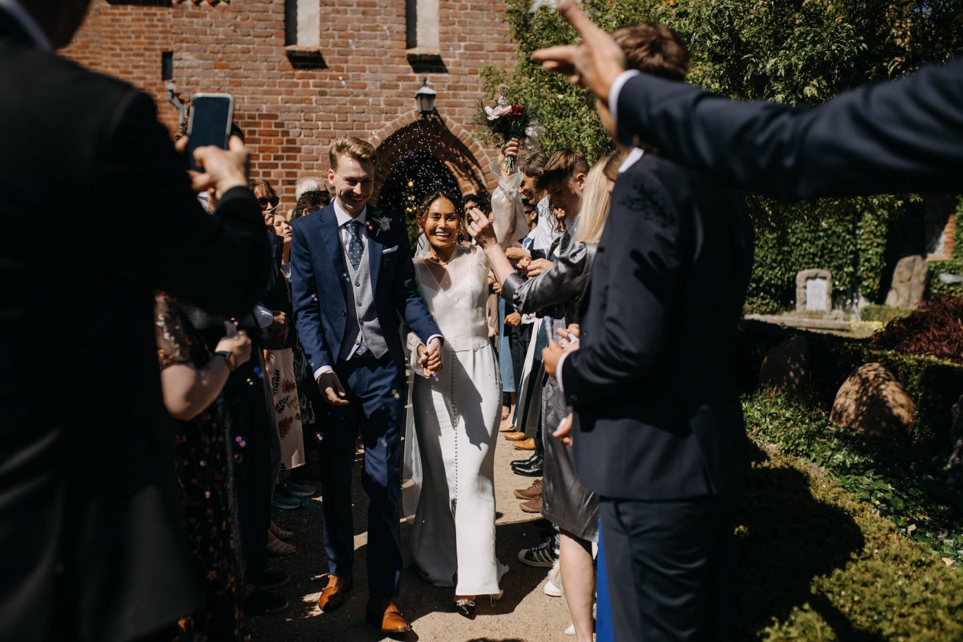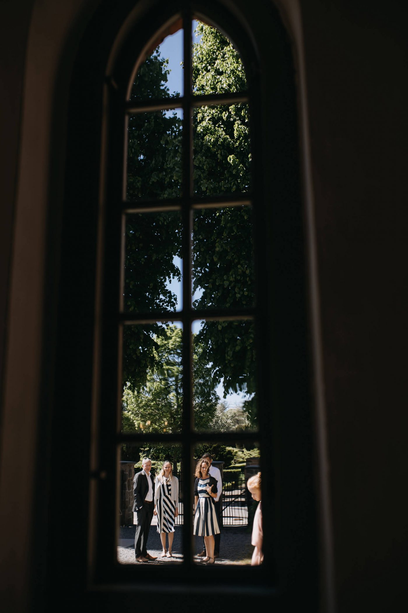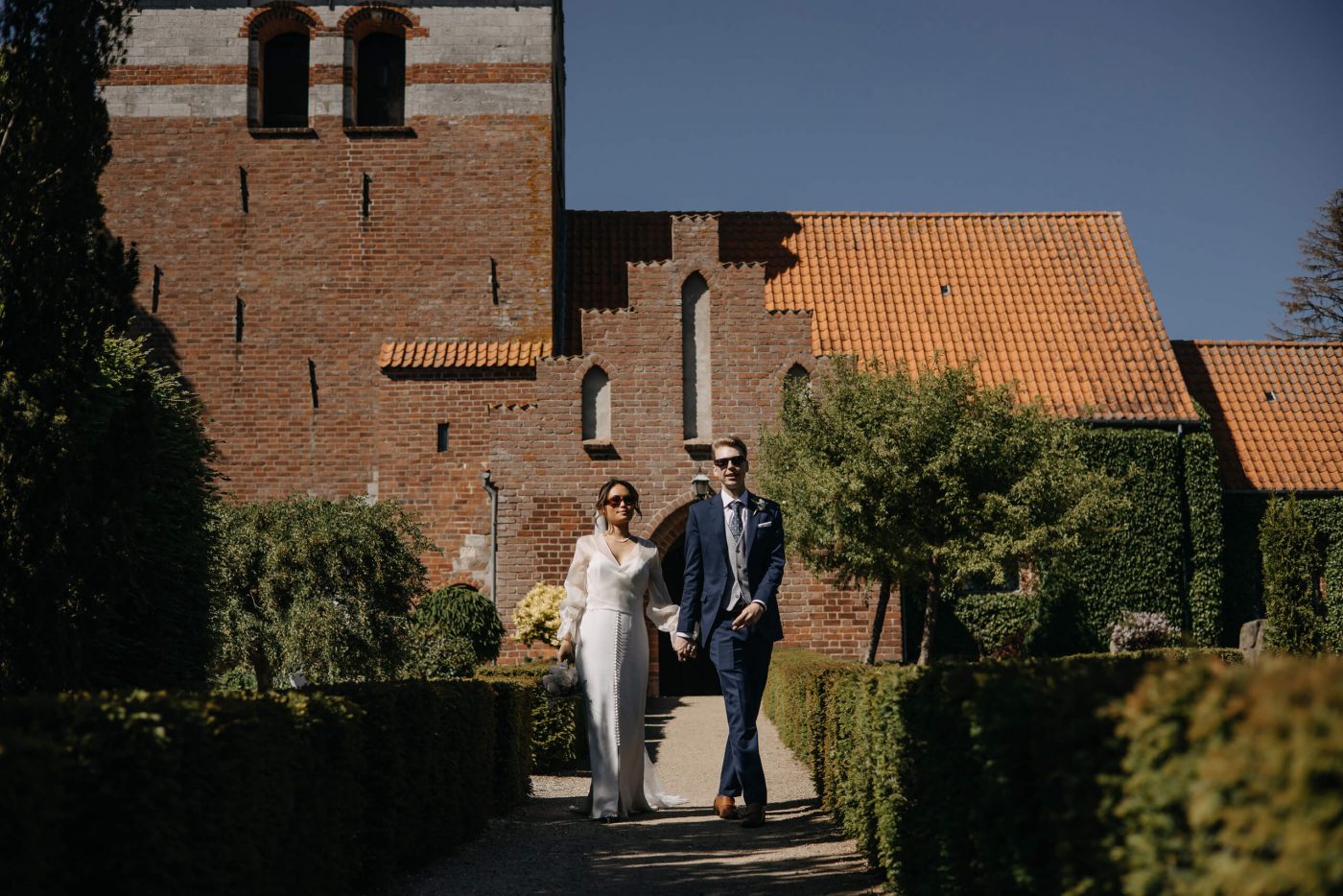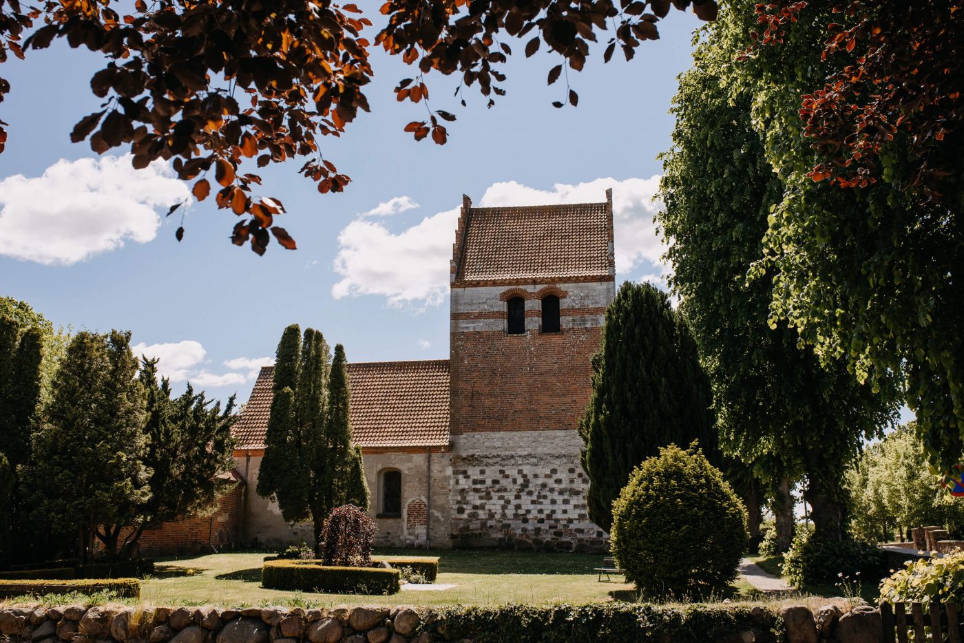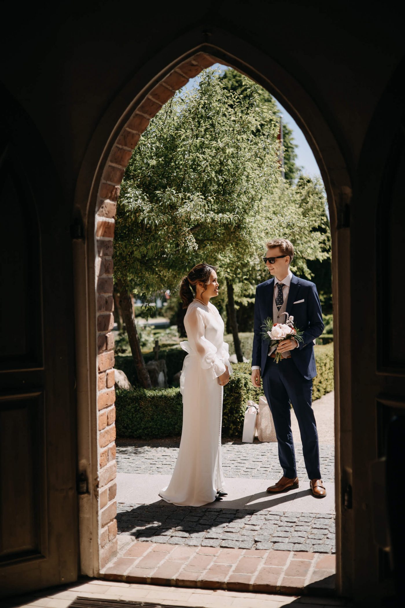 Allerslev Kirke is an exceptionally beautiful location for a wedding ceremony, situated not far from Roskilde. Guests gather near the church, eagerly awaiting the start of the ceremony. The summer sun is high, casting a warm glow under the tree canopies and inside the church, providing a pleasant coolness. Mark eagerly awaits Grace at the altar.