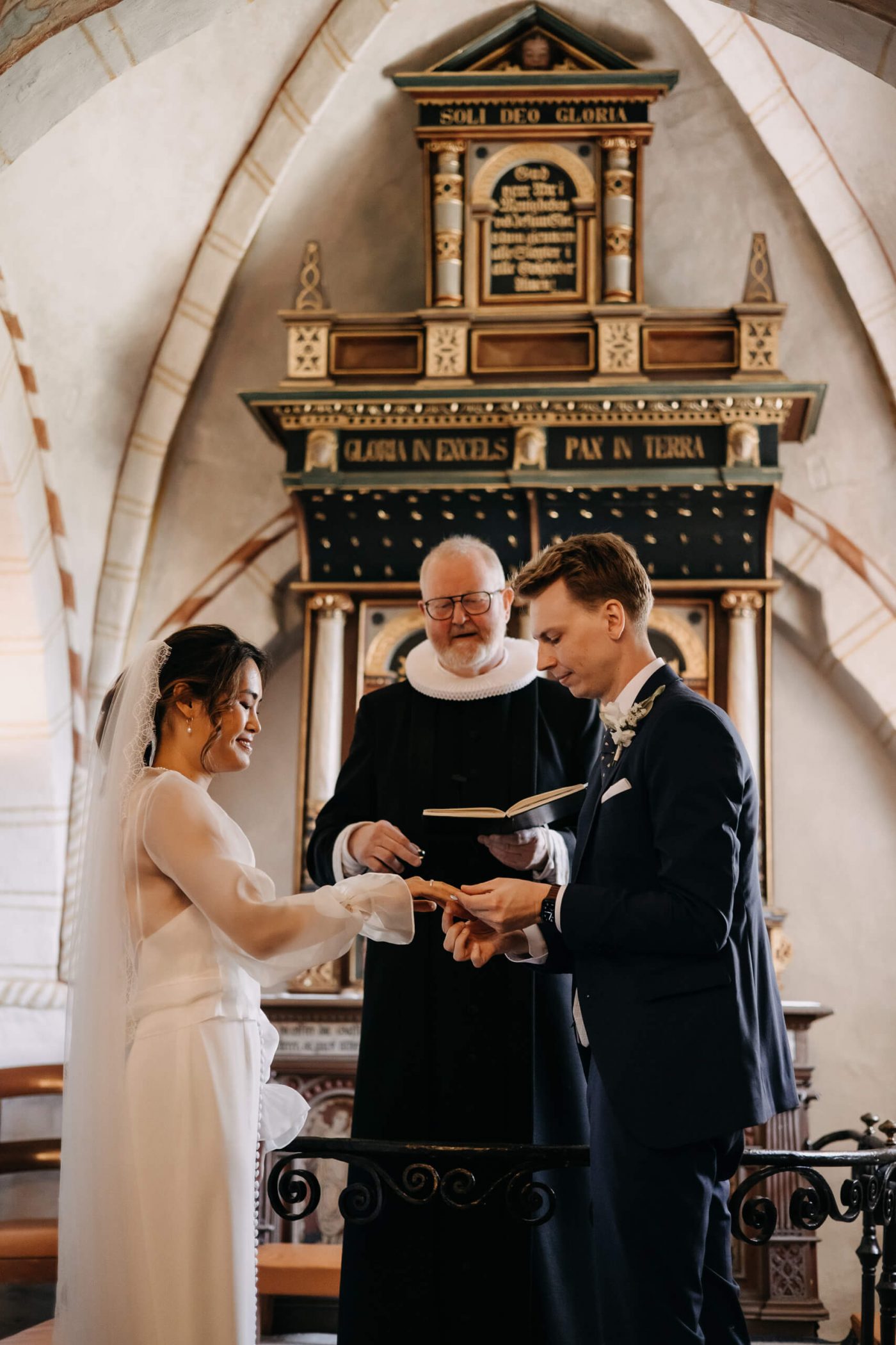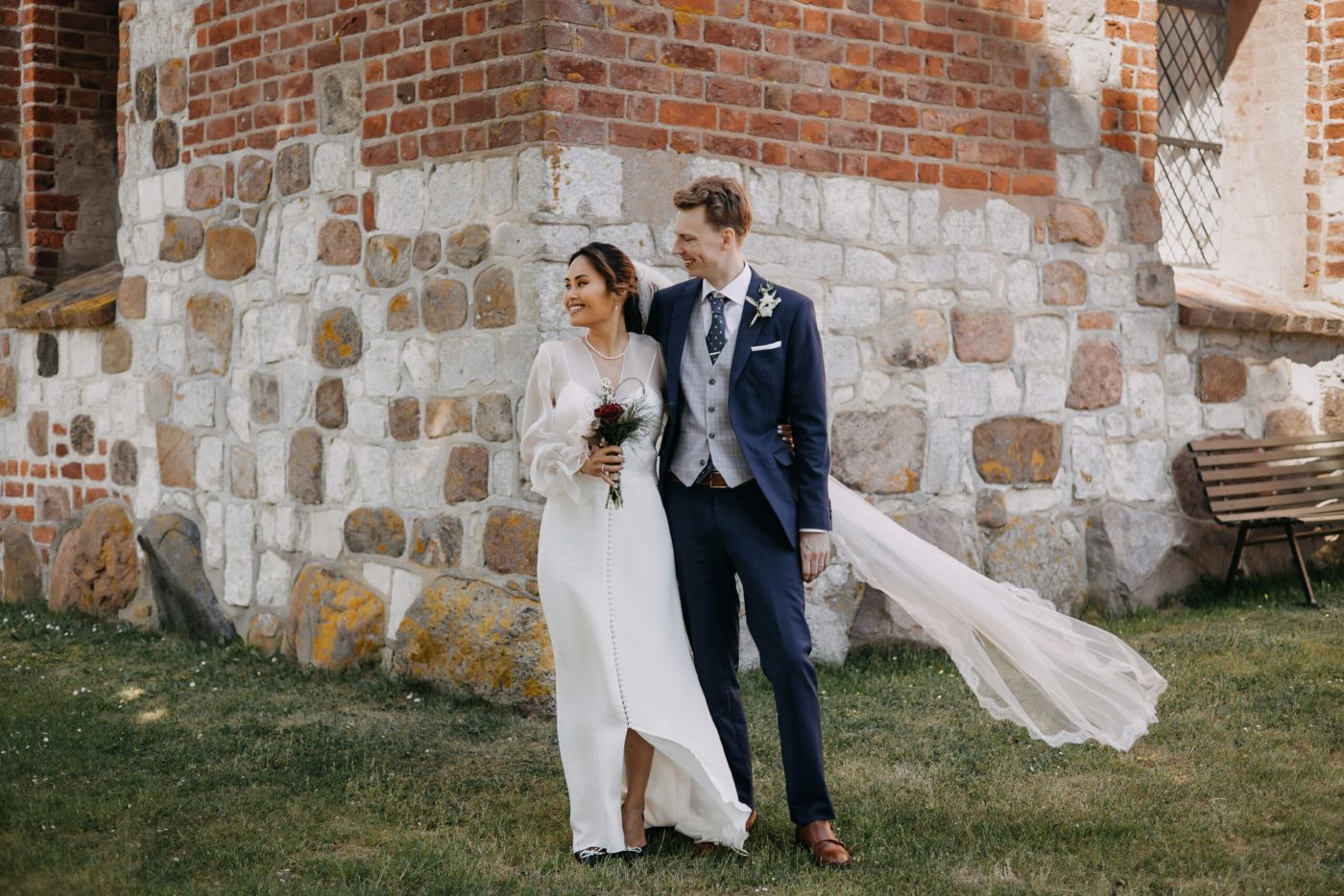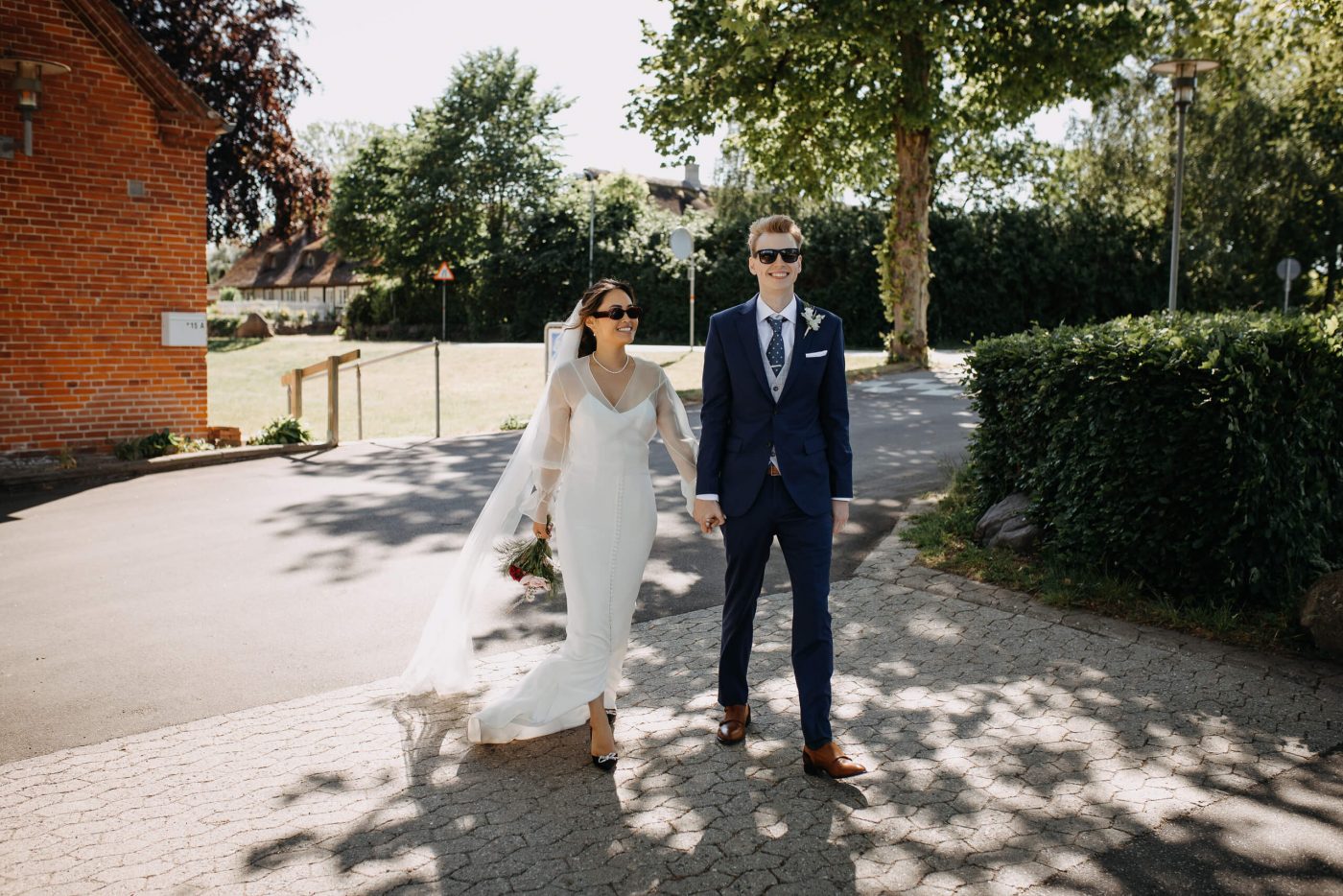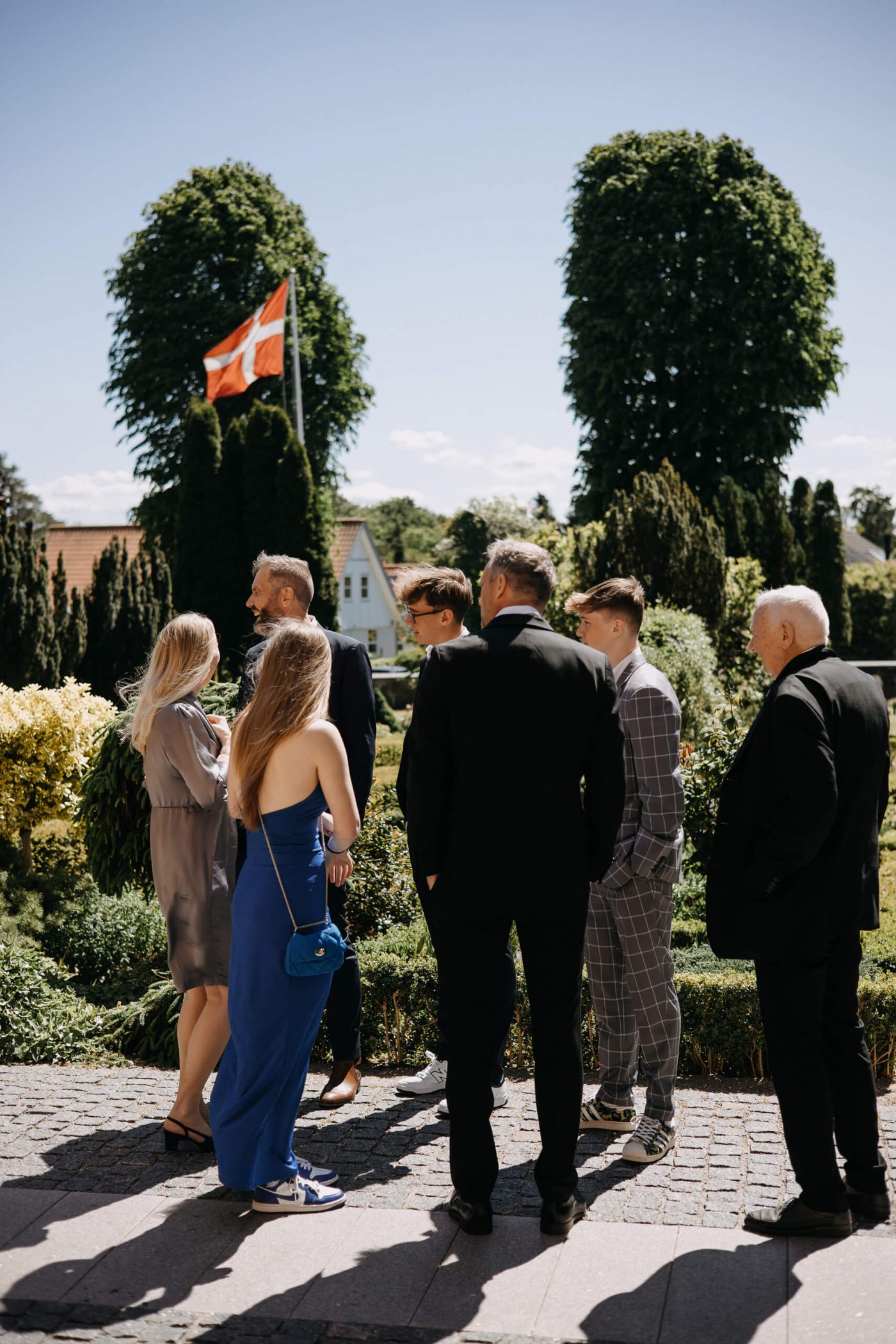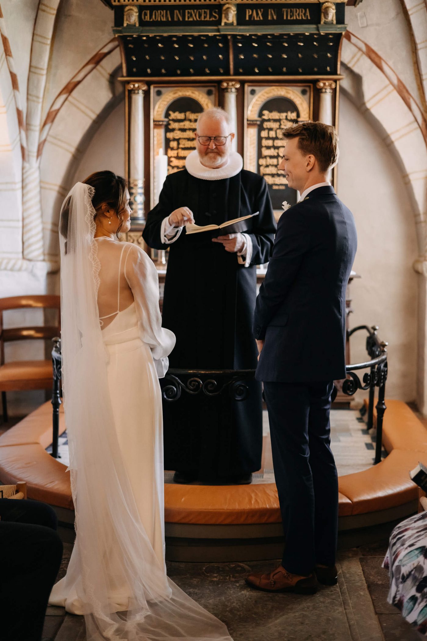 Allerslev Kirke is an exceptionally beautiful location for a wedding ceremony, situated not far from Roskilde. Guests gather near the church, eagerly awaiting the start of the ceremony. The summer sun is high, casting a warm glow under the tree canopies and inside the church, providing a pleasant coolness. Mark eagerly awaits Grace at the altar.