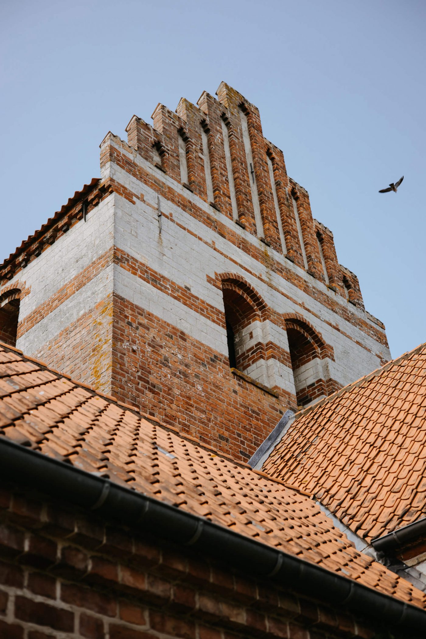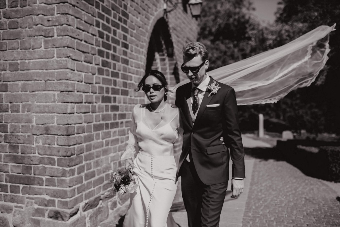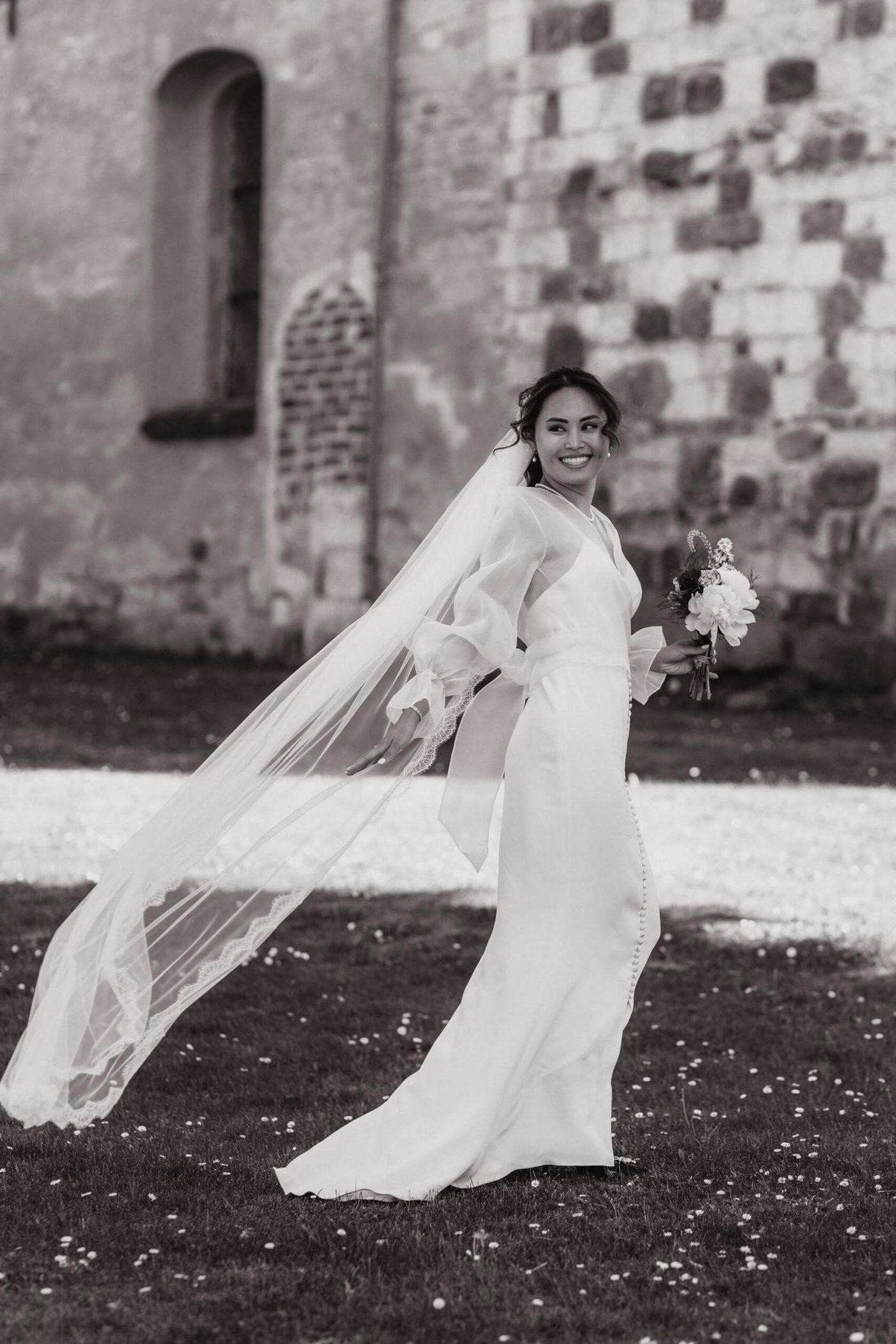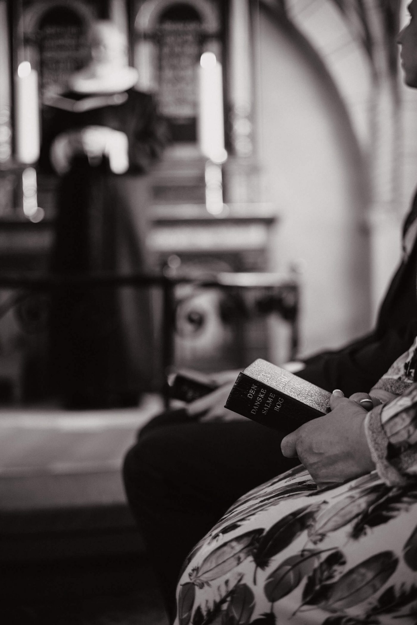 Allerslev Kirke is an exceptionally beautiful location for a wedding ceremony, situated not far from Roskilde. Guests gather near the church, eagerly awaiting the start of the ceremony. The summer sun is high, casting a warm glow under the tree canopies and inside the church, providing a pleasant coolness. Mark eagerly awaits Grace at the altar.