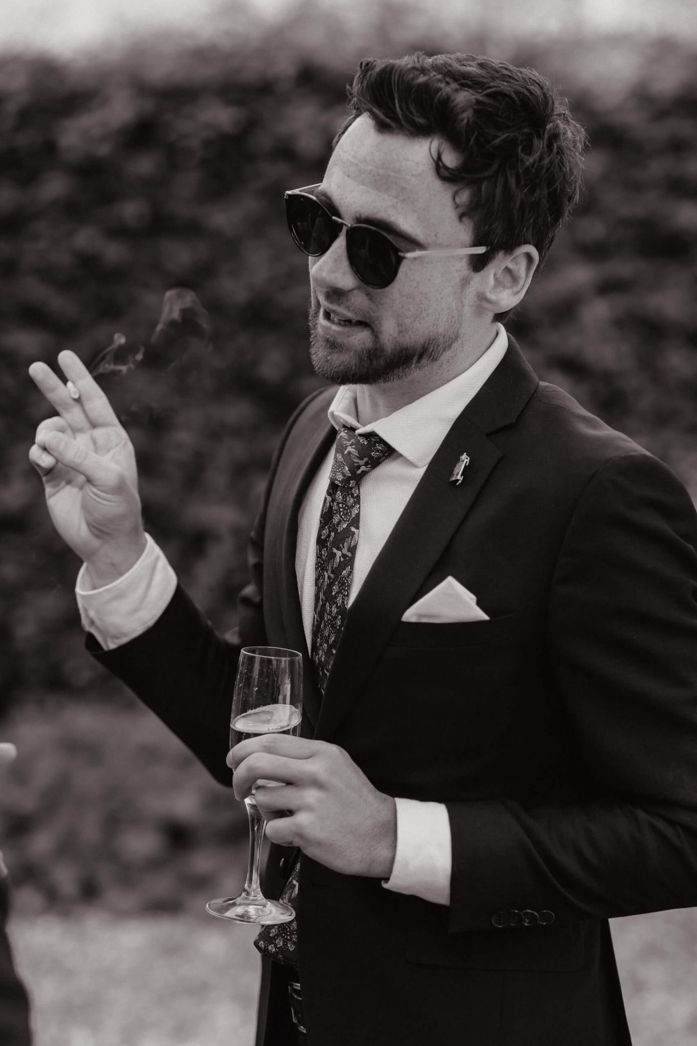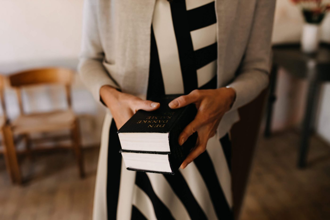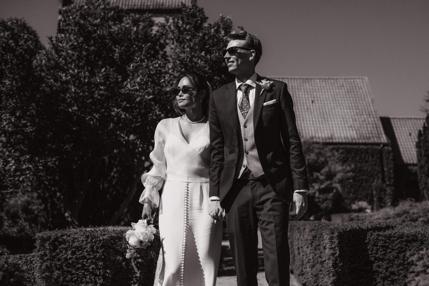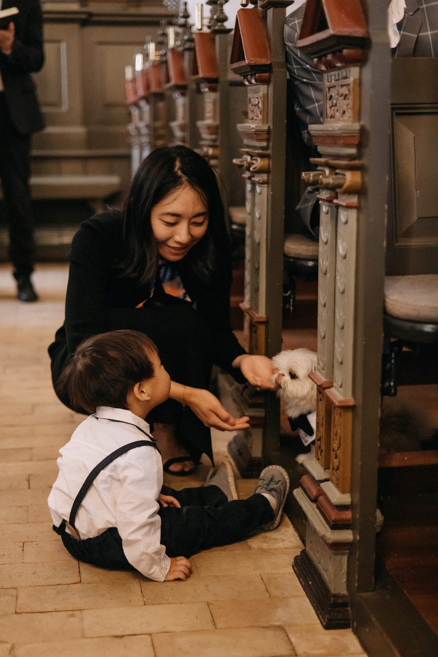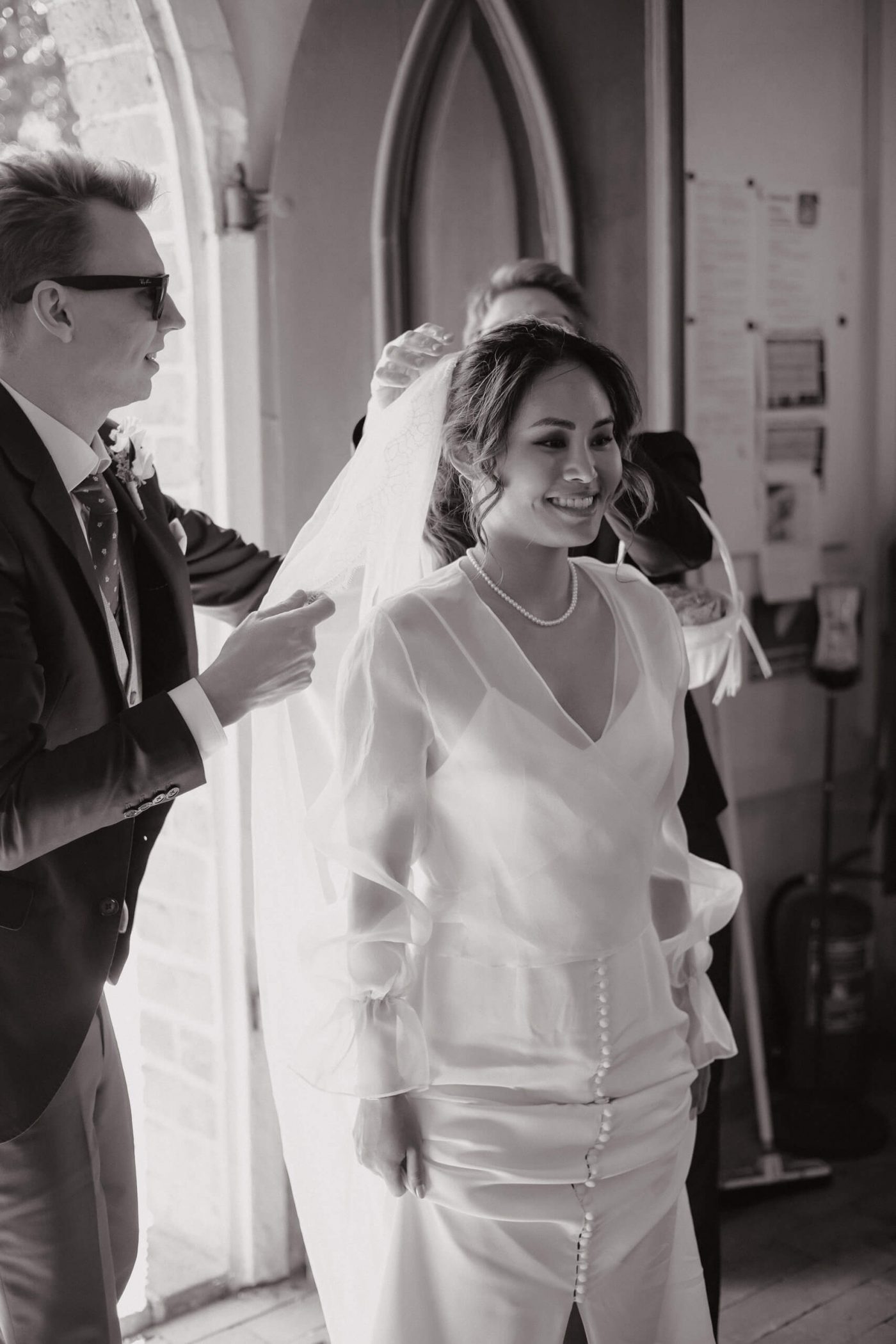 Allerslev Kirke is an exceptionally beautiful location for a wedding ceremony, situated not far from Roskilde. Guests gather near the church, eagerly awaiting the start of the ceremony. The summer sun is high, casting a warm glow under the tree canopies and inside the church, providing a pleasant coolness. Mark eagerly awaits Grace at the altar.
