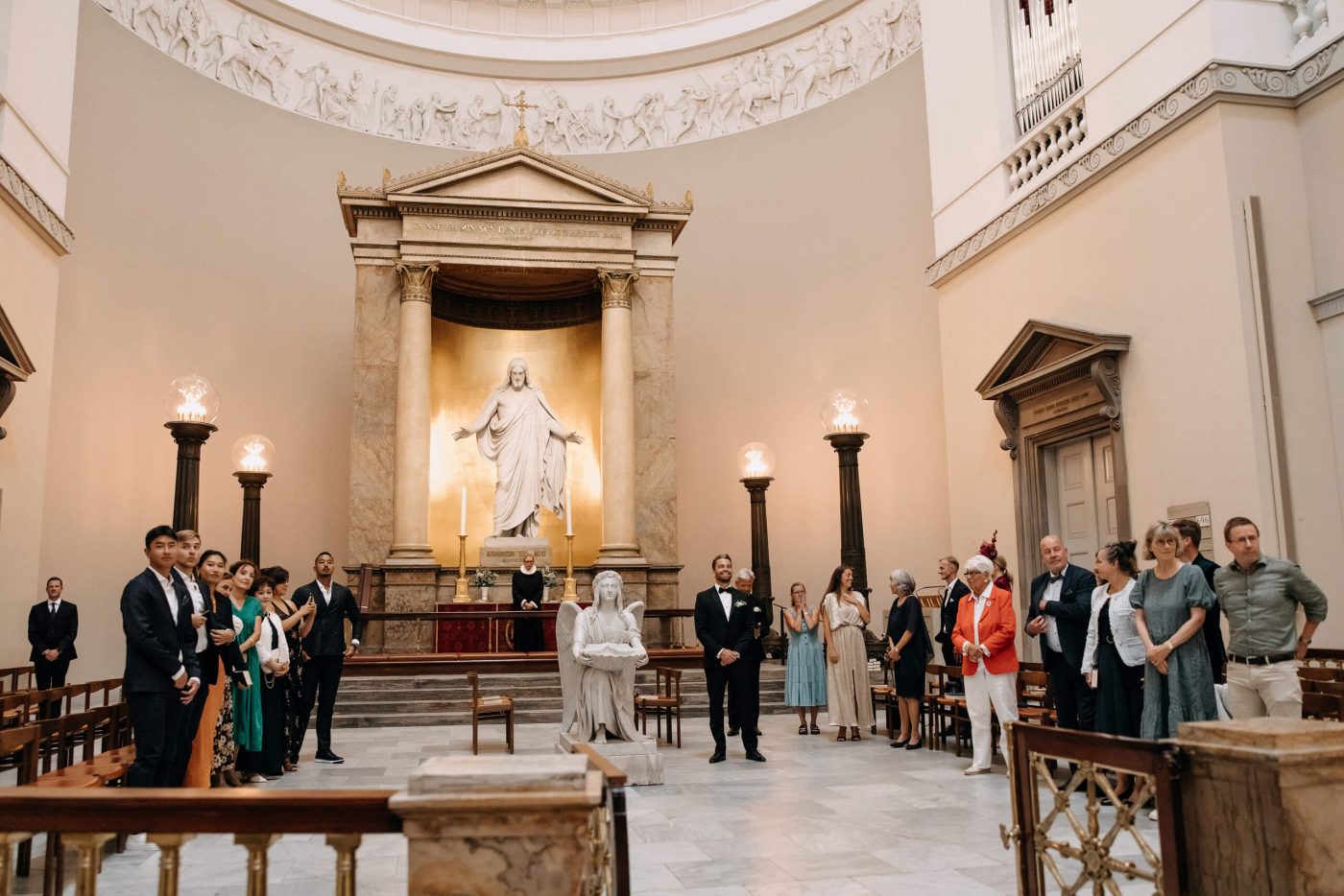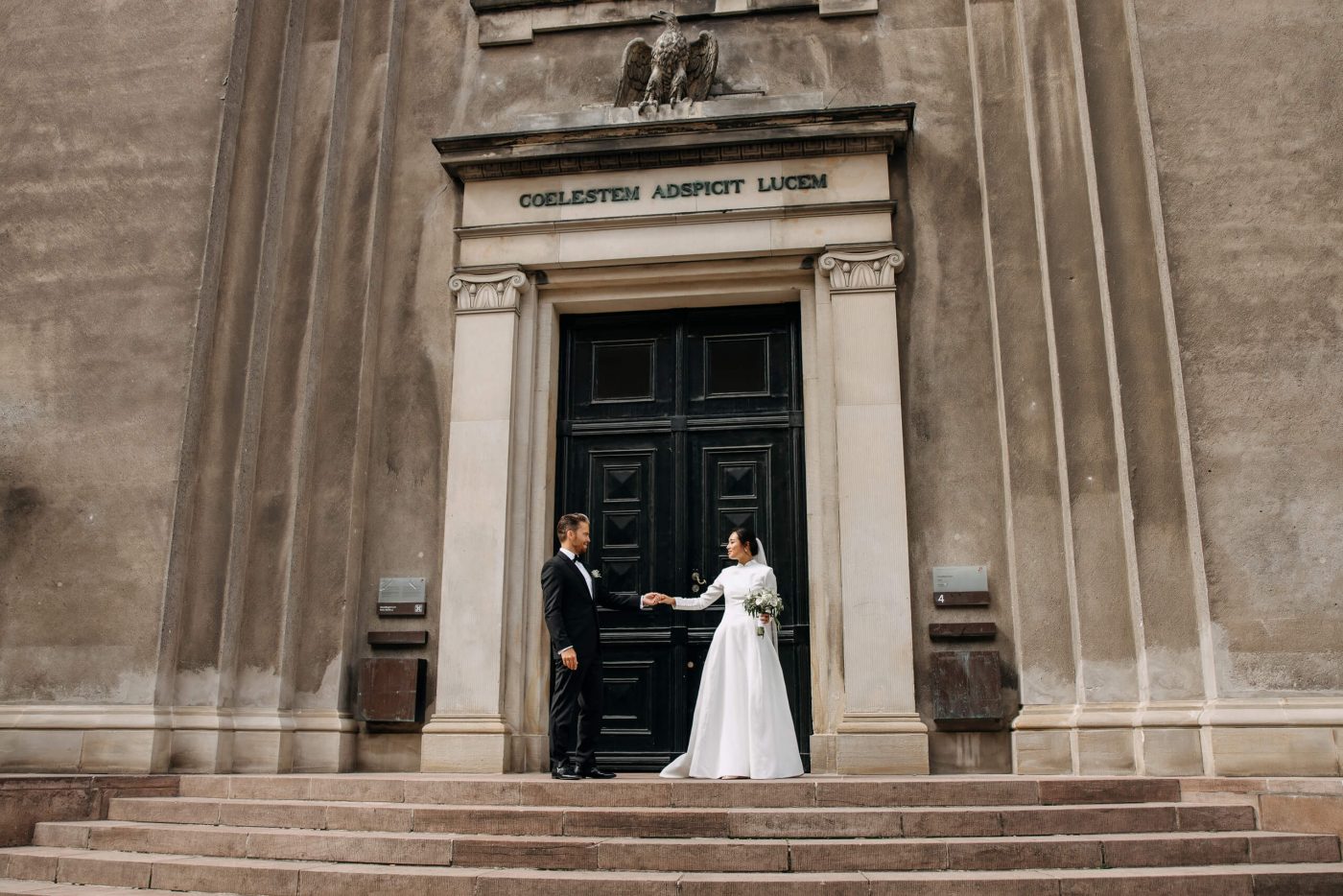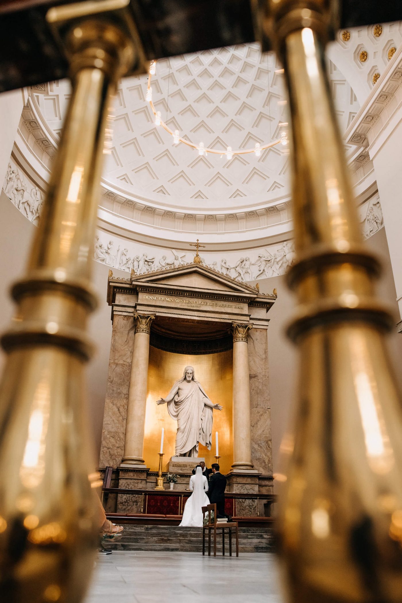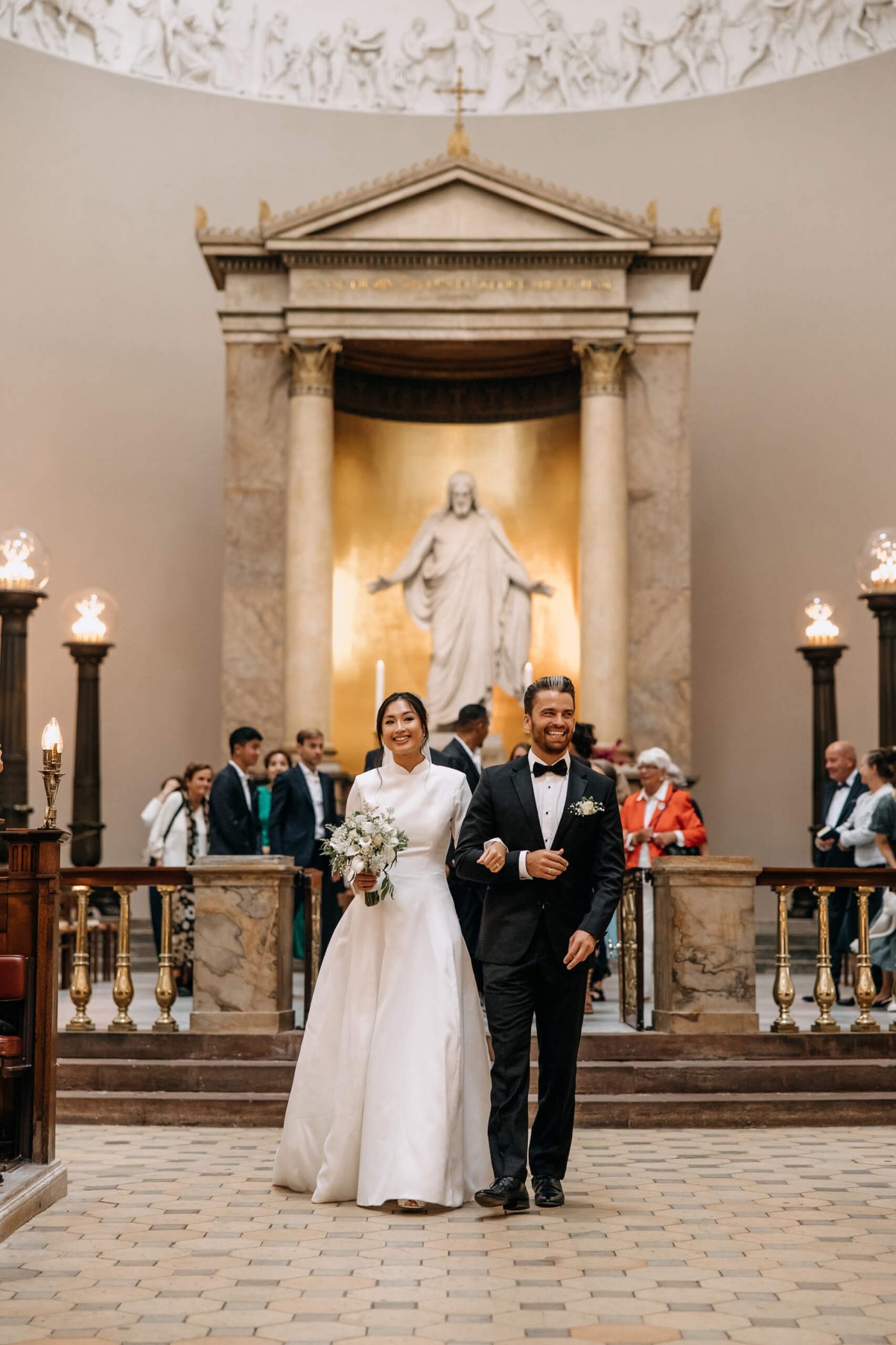 In the heart of Copenhagen, beneath the grand columns of Vor Frue Kirke, Daniel & Mi stood together, ready to begin their new chapter. There was something magical about that moment—inside the historic church, time seemed to pause, letting their love take center stage.