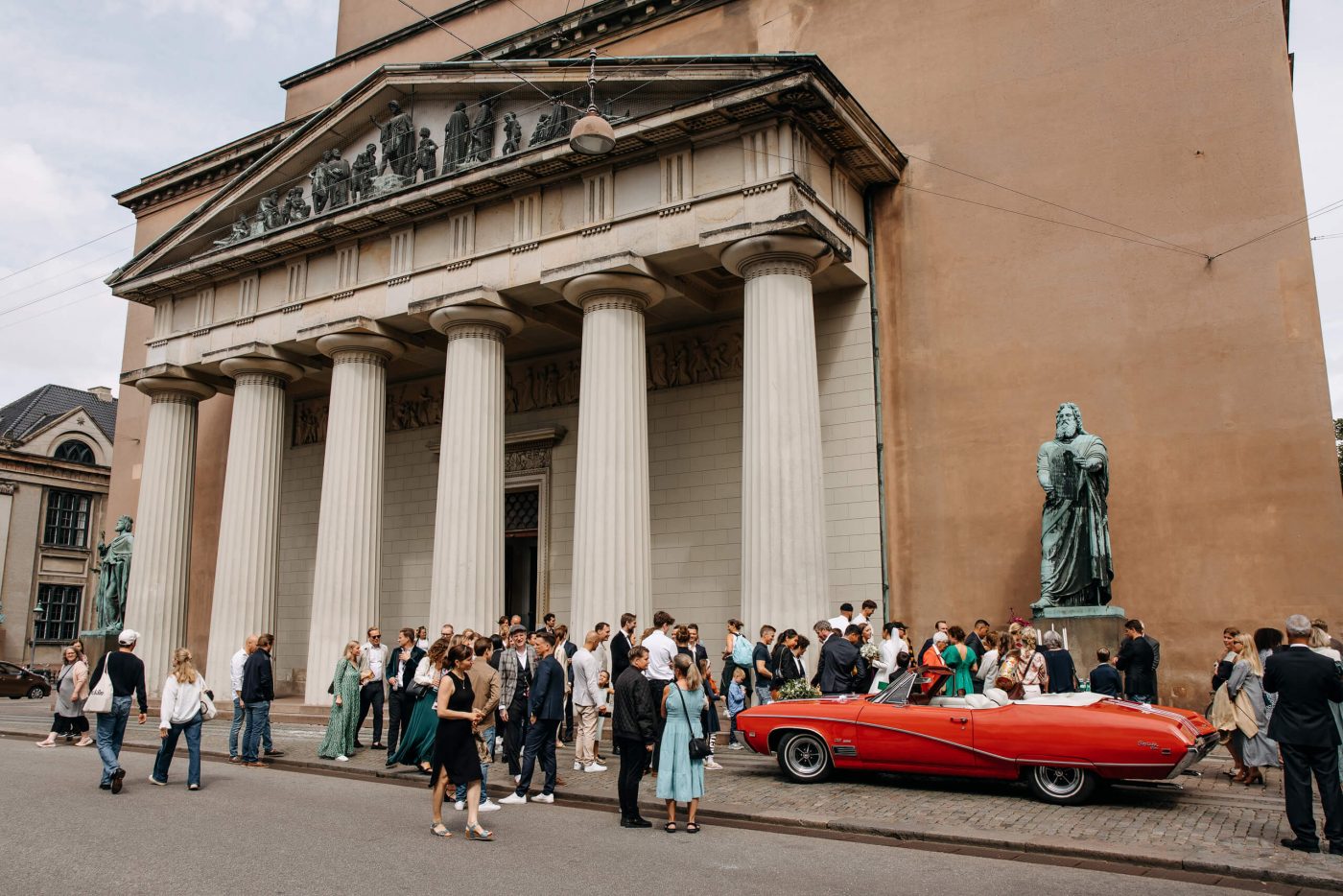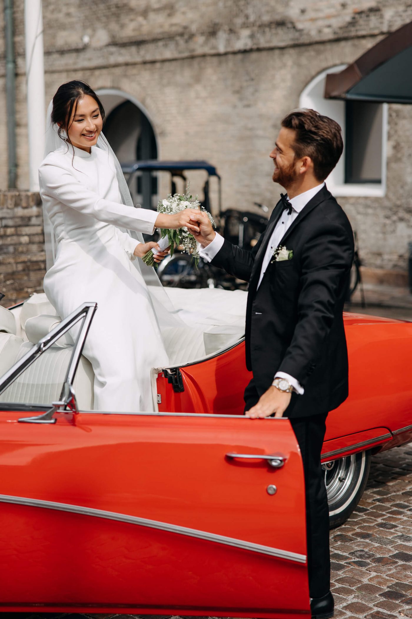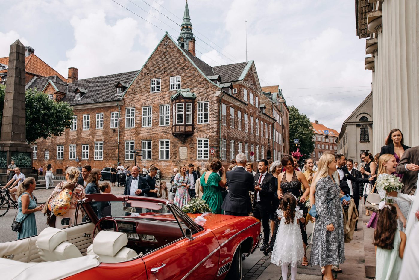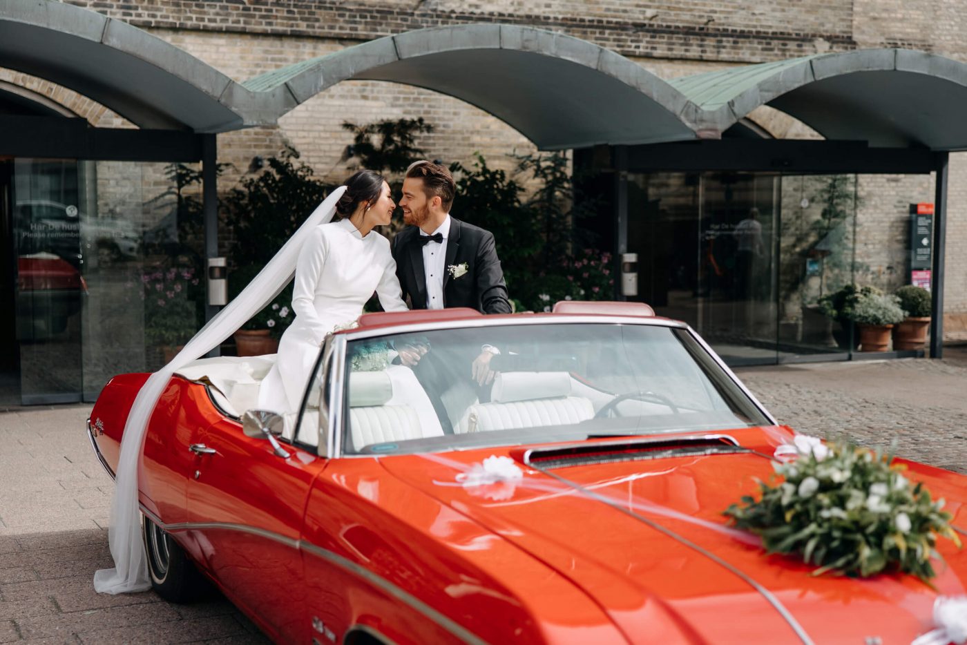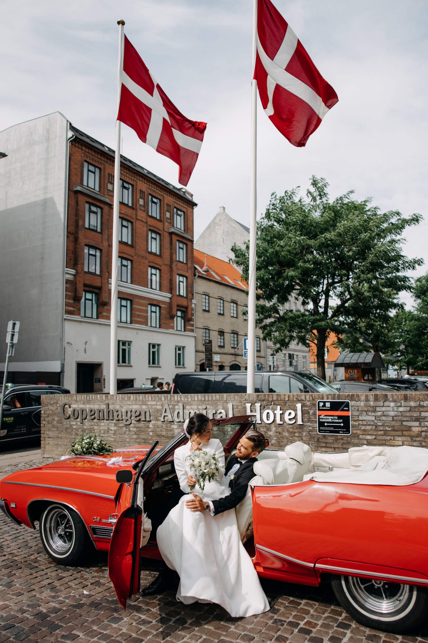 As they stepped outside, the charm of a vintage red Buick awaited them, a perfect touch of nostalgia to carry them to their reception at the Admiral Hotel. But before the celebration began, we took a little detour—a wedding photoshoot in front of the iconic Copenhagen Opera House. Against the sleek, modern architecture, their love shone effortlessly, creating timeless portraits they will cherish forever.